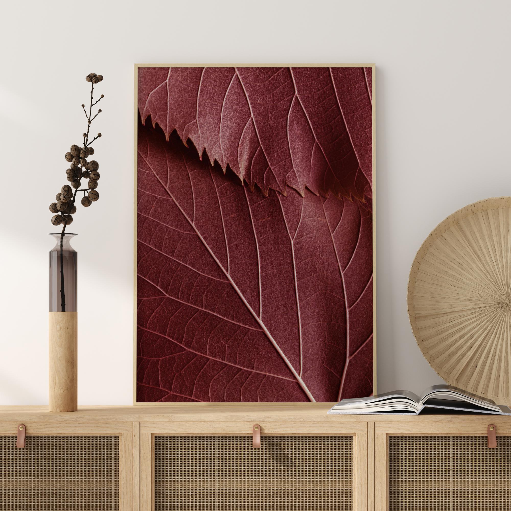 Botanikai fotóművészet sötétvörös levelekkel és élénk mintákkal. Egy elegáns poszter meleg árnyalatokban, olyan stílusban, amely tökéletesen kombinálható más kellemes motívumokkal egy nagyobb kép falán.