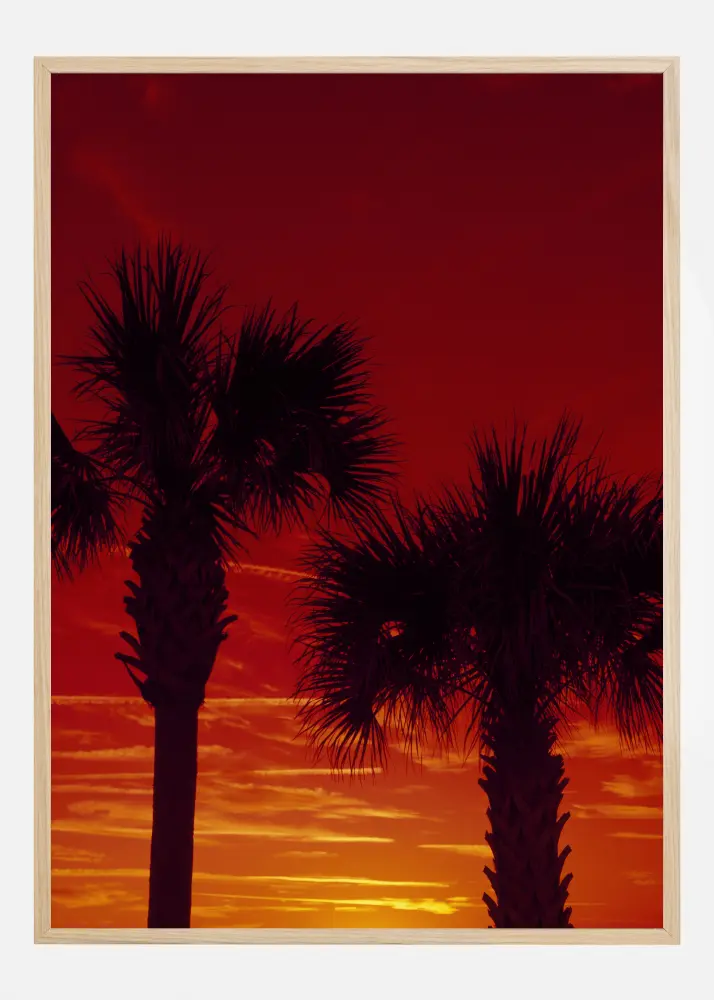 Egy poszter két pálmafáról sziluettben egy mélyvörös égbolttal szemben, amely baljós érzést kelt. A naplemente alja sárga, és mélyvörössé válik, amikor a pálmafák teteje fölé emelkedik. Ez drámai megjelenést kölcsönöz, amely a szívedet megdobogtatja, amikor egy semleges fallal kombinálod.