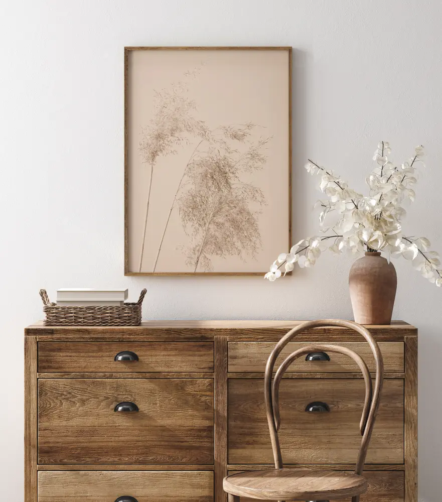 Egy természetfotó plakát, amelyen nád fű látható az ég felé. A fű magasan áll a fakó pasztellszínű égbolttal szemben. Igazi nyugalmat érezhetsz ennek a nyomatnak a segítségével.