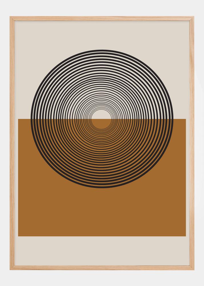 Ez a stílusos poszter hipnotikus mintázatával vonzza a tekintetet, ahol fekete vonalak alkotnak egy kiváló optikai illúziót, amelyet egy gazdag okker háttér helyez el, ami egy táj horizontját ábrázolja. A körforma felső fele naplementét vagy holdfelkeltét idéz, míg a söprő vonalak mozgást és mélységet teremtenek, ezáltal adva ennek a műalkotásnak egy retro hangulatot modern csavarral.