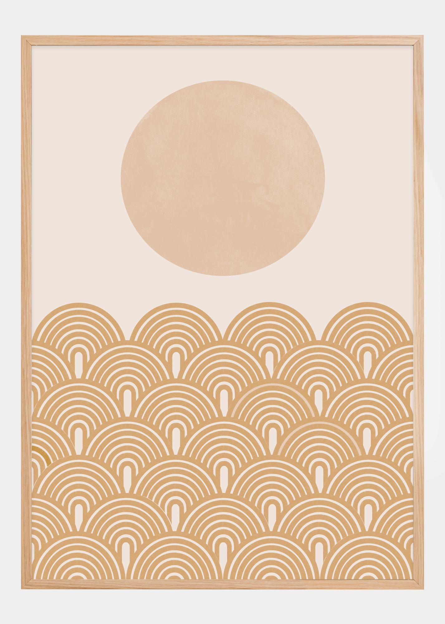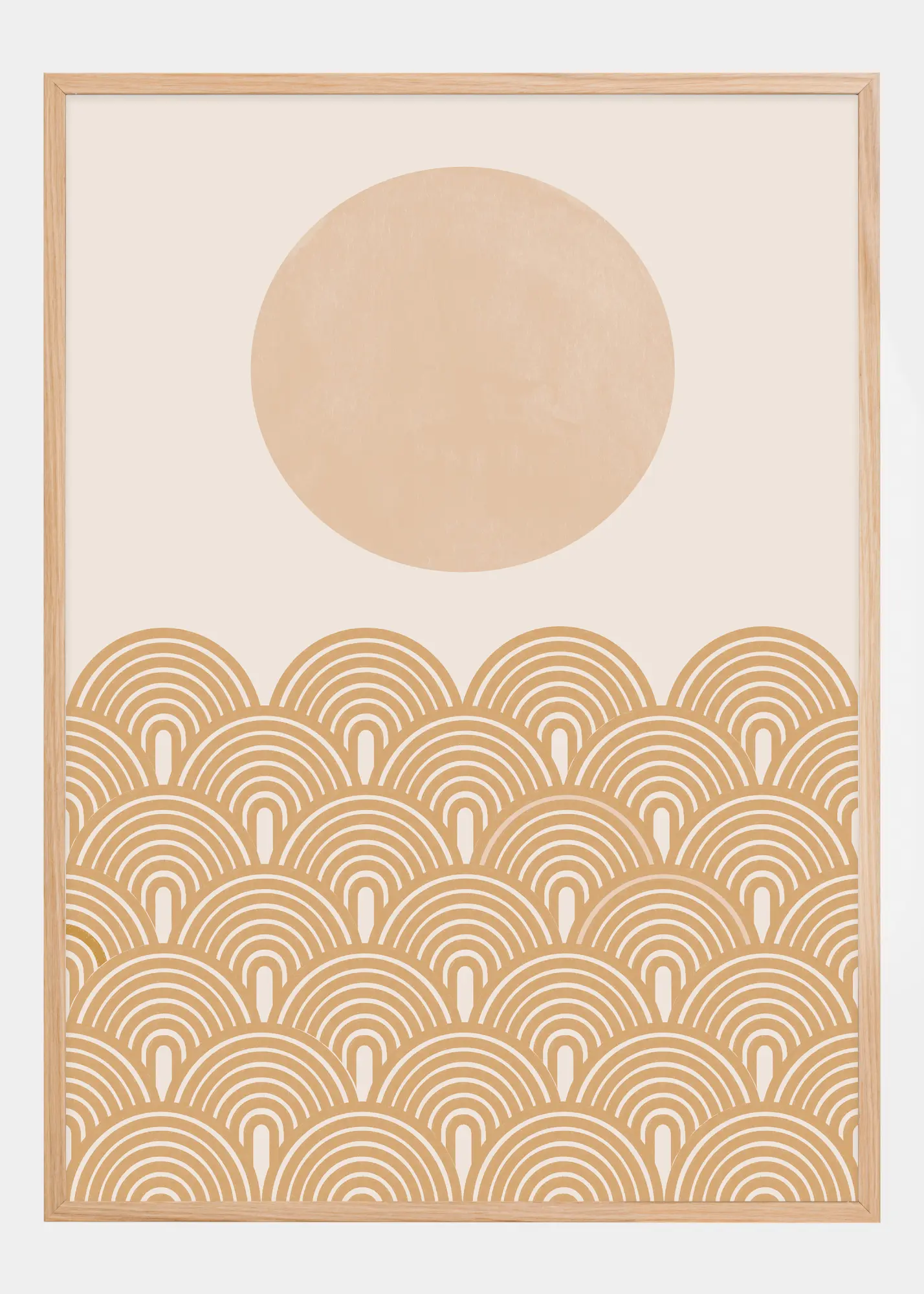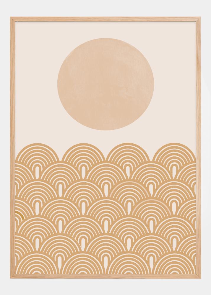 Ez a poszter a retró stílusok és a nyári hangulatok napos értelmezése, amelyben egy nagy, halvány rózsaszín kör lebeg egy íves elemek meleg terrakotta tónusú mintája felett. Az ívek összekapcsolódnak úgy, hogy hullámokra vagy dombokra emlékeztetnek, ami mozgás és élénkség érzetét kelti. A lágy színválasztás hozzájárul a melegség és nyugalom érzéséhez.