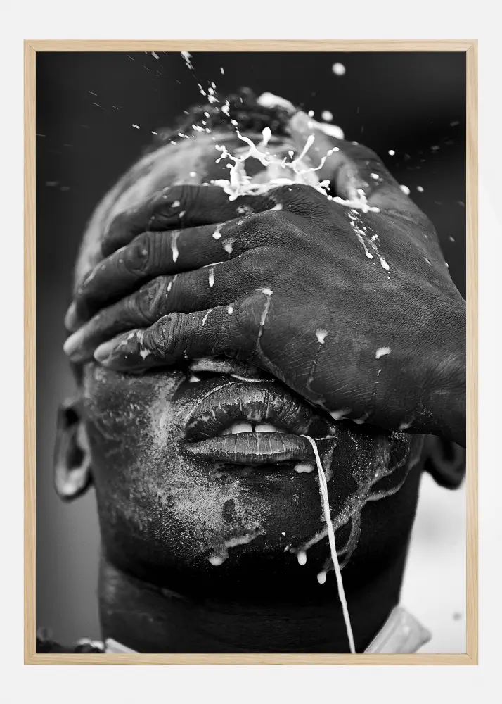 Egy közeli kép plakátja egy férfi portréjával, aki a kezével takarja el az arcát. Fehér tejfoltok úgy tűnik, mintha felülről esnének és az arcára csapódnának, a cseppek a levegőben pattognak. A szája kissé nyitva van, ez a kép egy lenyűgöző és részletes tanulmány, amelyet órákig fogsz csodálni.