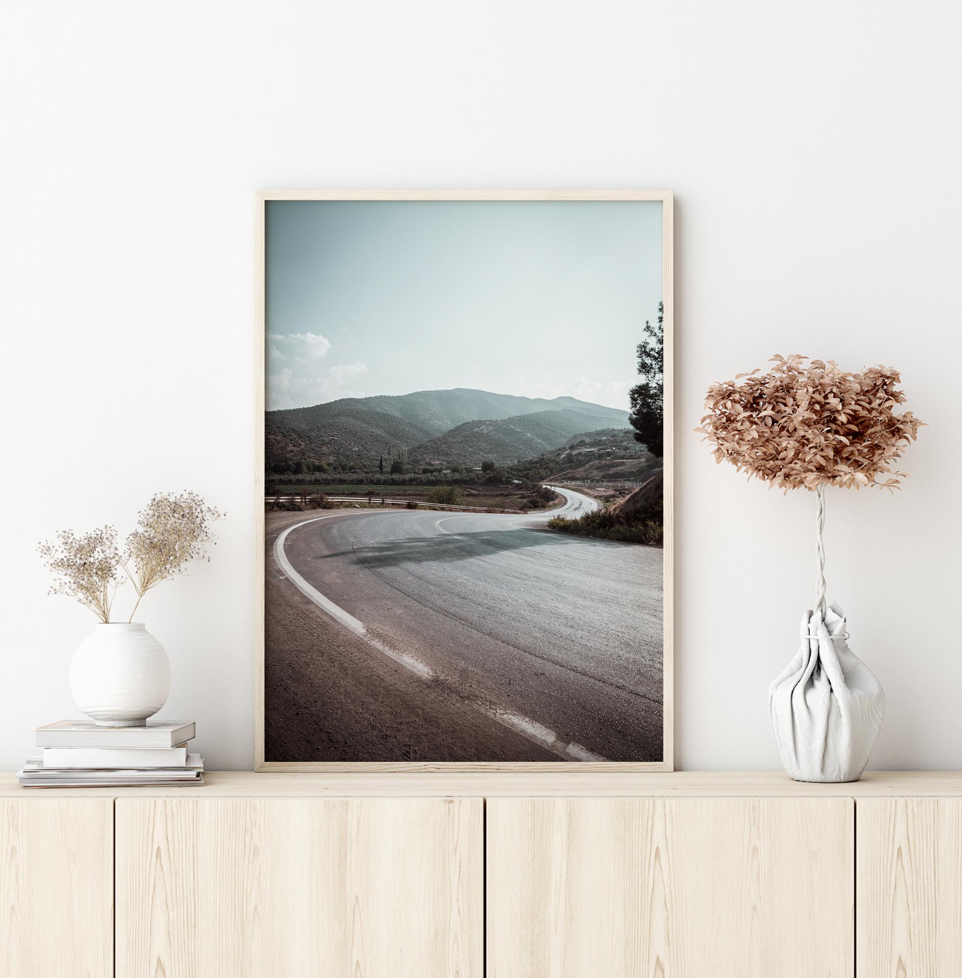 Egy festői poszter egy úttal, amely kígyózik a hegyek között. Egy magányos aszfaltút kanyarog a távolba a távoli hegycsúcsok felé. A színek lágyak és egy tavaszi napra emlékeztetnek, amikor lenyitott tetővel autózik az ember. Érezze azt a könnyed, levegős érzést ezzel a poszterrel.