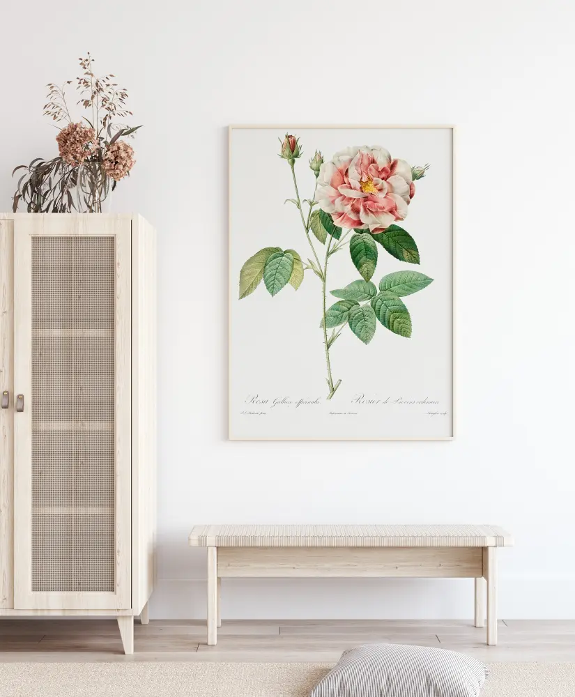 Egy fantasztikus poszter akvarell festménnyel egy rózsáról. A rózsaszín és fehér rózsa a fehér háttér előtt virágzik. Egy erős szár tartja a rózsát, miközben a részletes levelek lent elterülnek. Helyezze ezt az illusztrációt a falára, és párosítsa lágy rózsaszín árnyalatokkal.