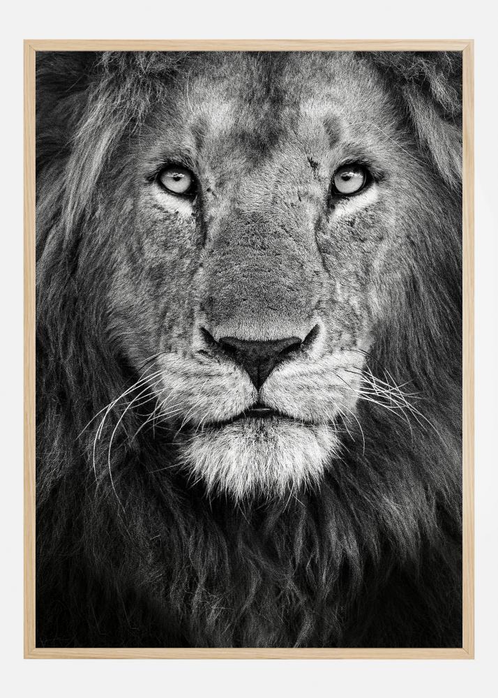 Ez az erőteljes és kifejező poszter egy közeli portrét ábrázol egy fekete-fehér hím oroszlánról, amely megragadja az állat fenséges jelenlétét és vad lényegét. Az oroszlán intenzív tekintete, vastag sörénye és minden egyes bajusz életre kel a fénykép magas kontrasztjának és részletgazdagságának köszönhetően. Ez egy olyan motívum, amely azonnal vonzza a szemet és mély, maradandó benyomást kelt.