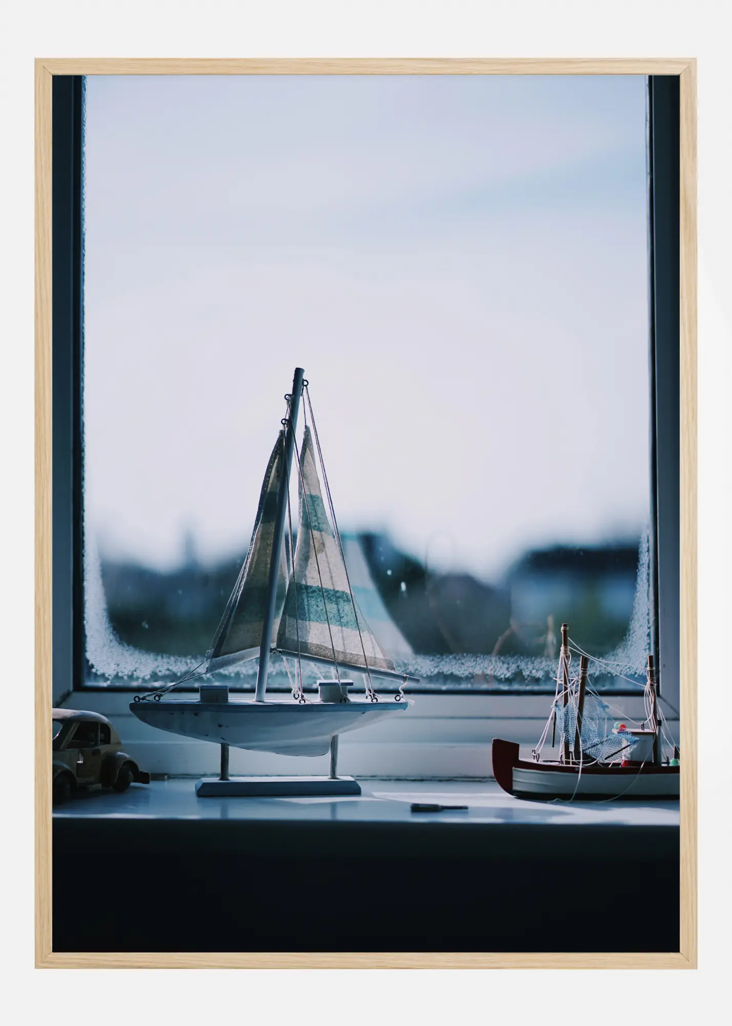 Egy kék poszter egy kis vitorlásmodellről, amely az ablakpárkányon ül, kilátással a külvilágra. A kék színek azt mutatják, milyen hideg van, és van kondenzáció az üvegen. A háttérben az égbolt látszik, és a játékcsónak vitorlái szinte a külvilág részévé válnak. Ez az, amiből az álmok készülnek.