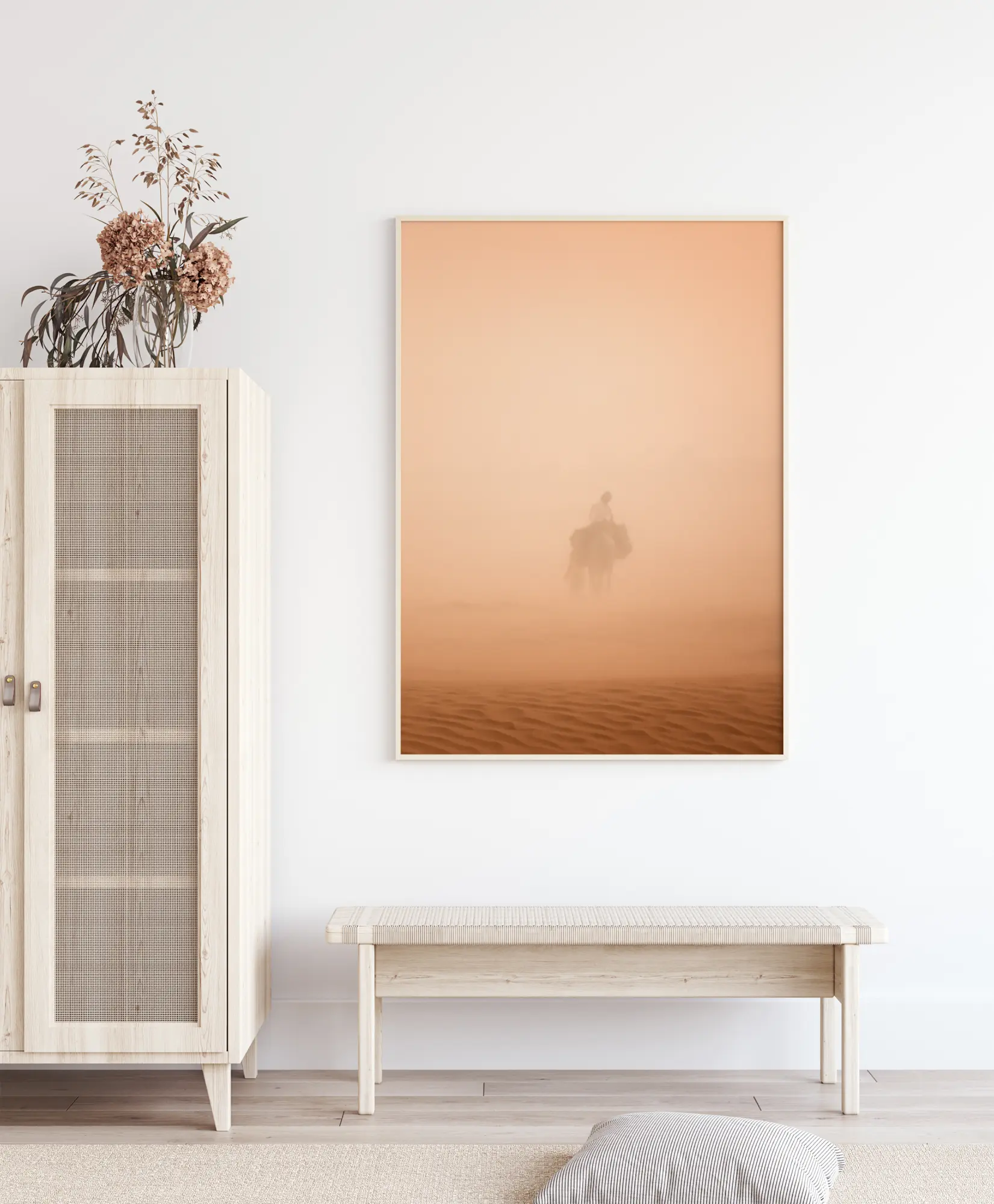 Egy meleg poszter homokviharral. Az előtérben látható a sivatagi homok, mielőtt eltűnik a lágy színek kavargó ködébe. Középen egy alak halvány formája látható, aki lovagol és küzd a viharban. Érezze a sivatagi forróságot.