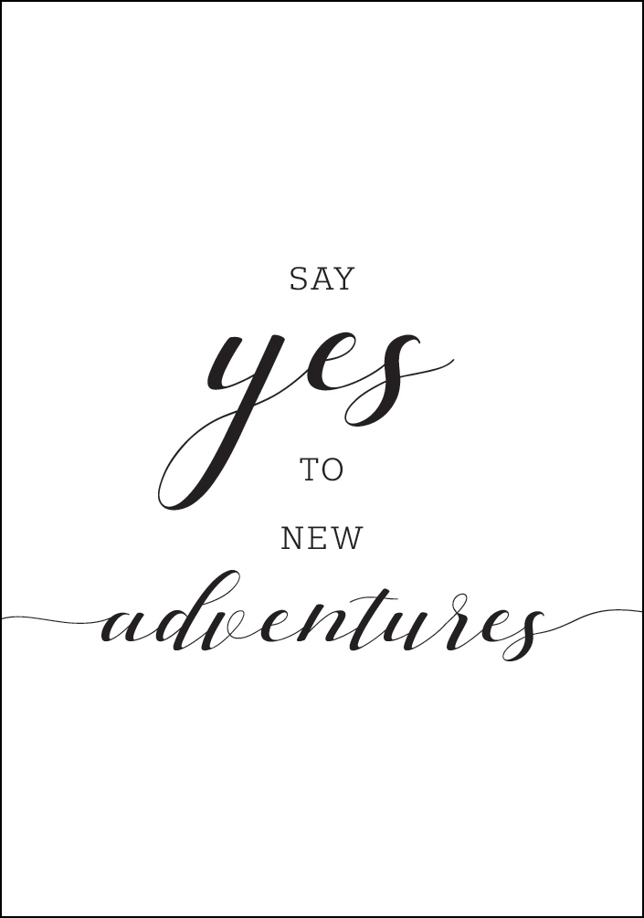 Egy kalligrafikus poszter egy vicces utazási idézettel kézírásos és gépírásos stílusban. Készülj fel arra, hogy igent mondj új kalandokra, amikor otthonodba akasztod ezt az egyszerű fekete-fehér idézetet. Inspirálódj minden nap, amikor rápillantasz erre a mondatra.