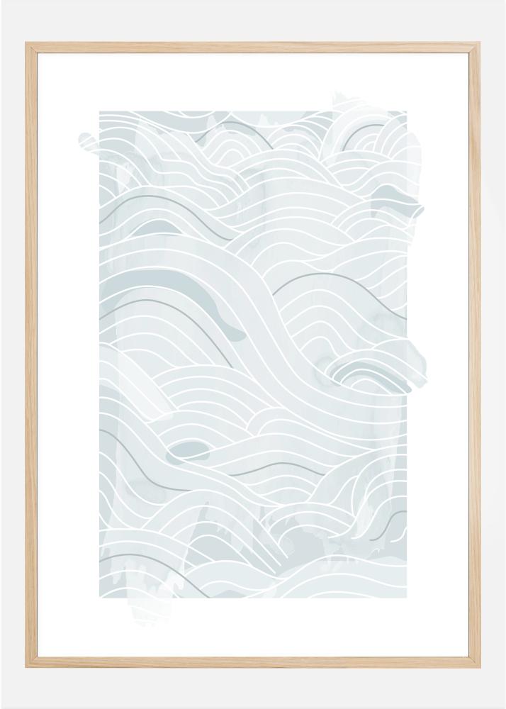 Egy tengeri poszter lágy kék absztrakt vonalakkal és hullámokkal fehér háttér előtt. Különböző kék árnyalatok és különböző vonalvastagságok kombinálódnak, hogy létrehozzák ezeket a hullámzó hullámokat az oldalon. Hagyd, hogy a gondolataid elkalandozzanak, és hagyd, hogy magukkal ragadjanak ebbe a lágy tengeri mintába.