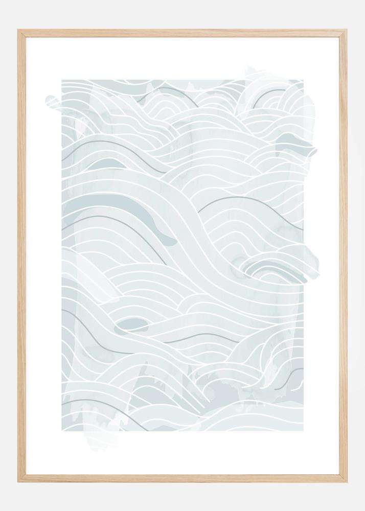 Egy tengeri poszter lágy kék absztrakt vonalakkal és hullámokkal fehér háttér előtt. Különböző kék árnyalatok és különböző vonalvastagságok kombinálódnak, hogy ezeket az áramló hullámokat hozzák létre az oldalon. Engedd el a gondolataidat, és hagyd, hogy elragadjon ez a lágy tengeri minta.