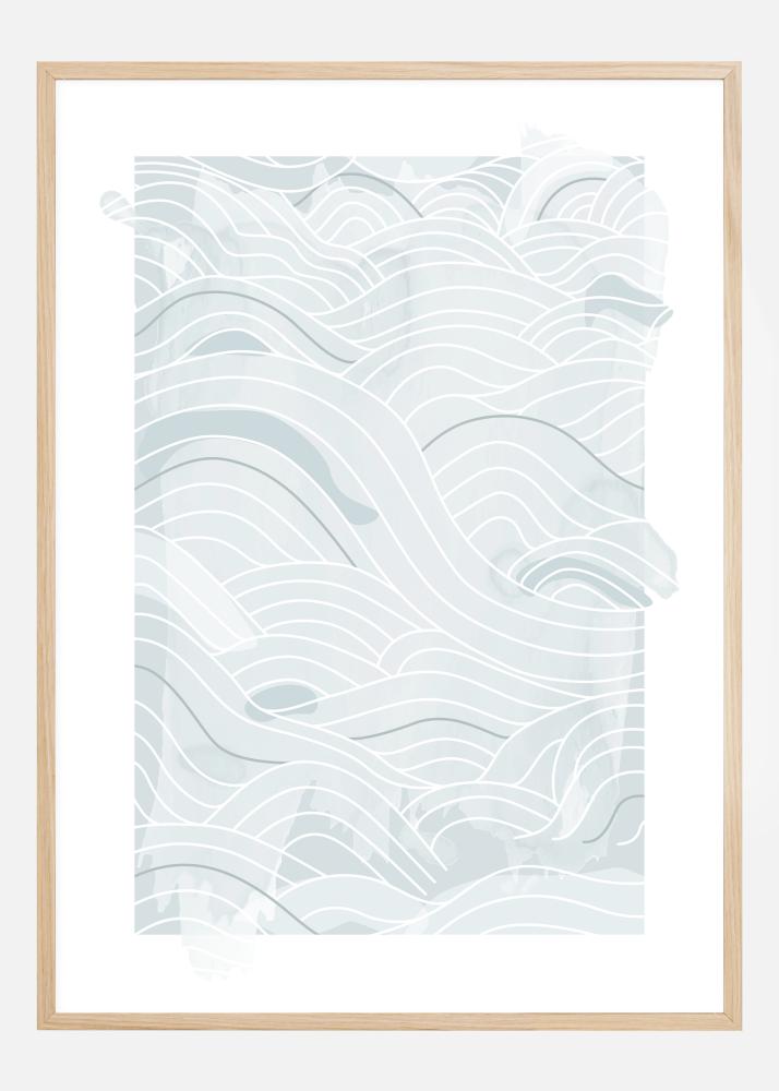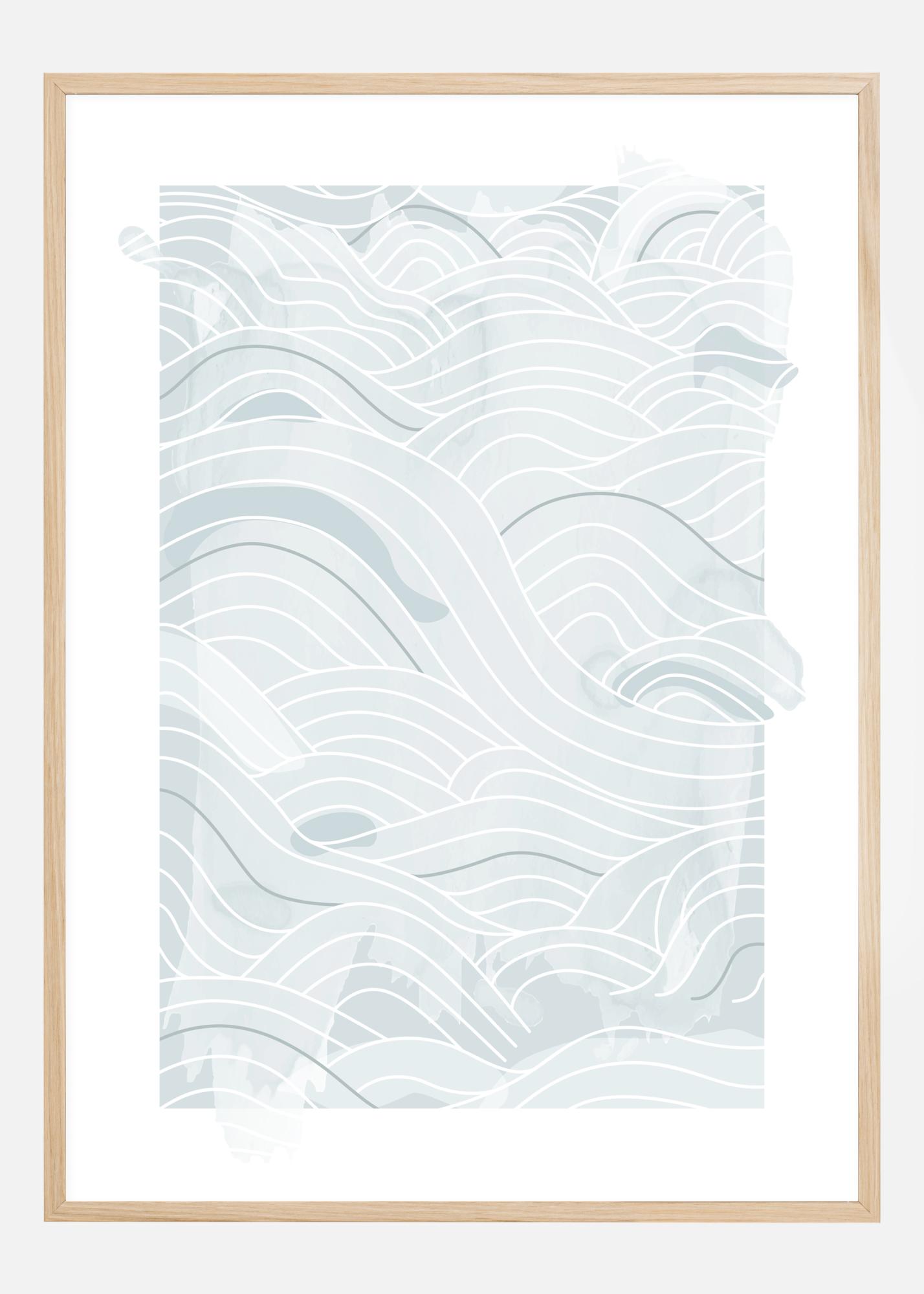 Egy tengeri poszter lágy kék absztrakt vonalakkal és hullámokkal fehér háttér előtt. Különböző kék árnyalatok és különböző vonalvastagságok kombinálódnak, hogy ezeket a hullámzó hullámokat alkossák az oldalon. Engedd, hogy a gondolataid elkalandozzanak, és hagyd, hogy elragadjon ez a lágy tengerminta.
