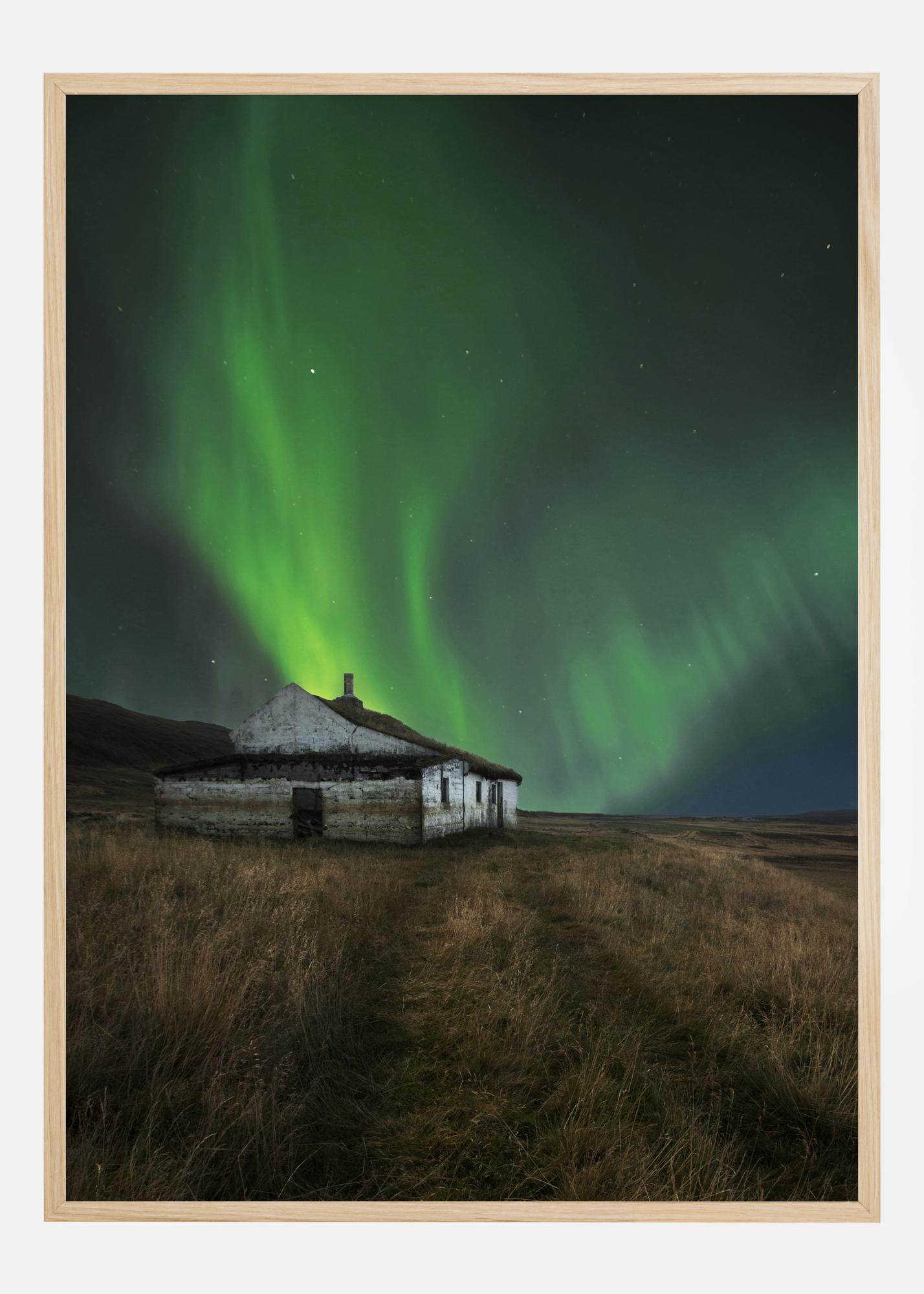 Egy fantasztikus poszter világoszöld és sárga északi fénnyel egy kis fehér ház fölött. Az északi fény élénk színei úgy tűnik, hogy mozognak és villóznak, amikor ránézel erre a lenyűgöző jelenetre. Éld át a természet nagyszerűségét, és hozd be ezt a természeti jelenséget otthonodba éterikus szépségért.
