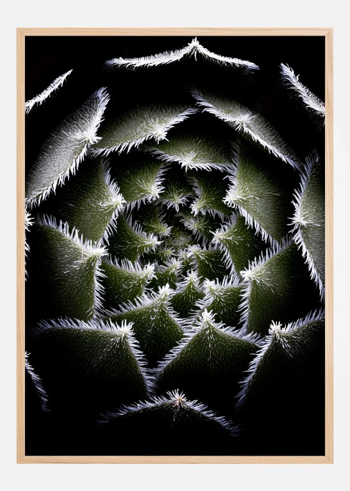 Makrofotó egy sempervivum rózsájáról. Ennek a növénynek a közeli képe mélyzöld levelek rózsáját mutatja, amelyek mindegyikén apró fehér tüskék vannak tollasítva. A részletek hihetetlenek, és mindenki meg fog állni ennél a lenyűgöző poszternél.