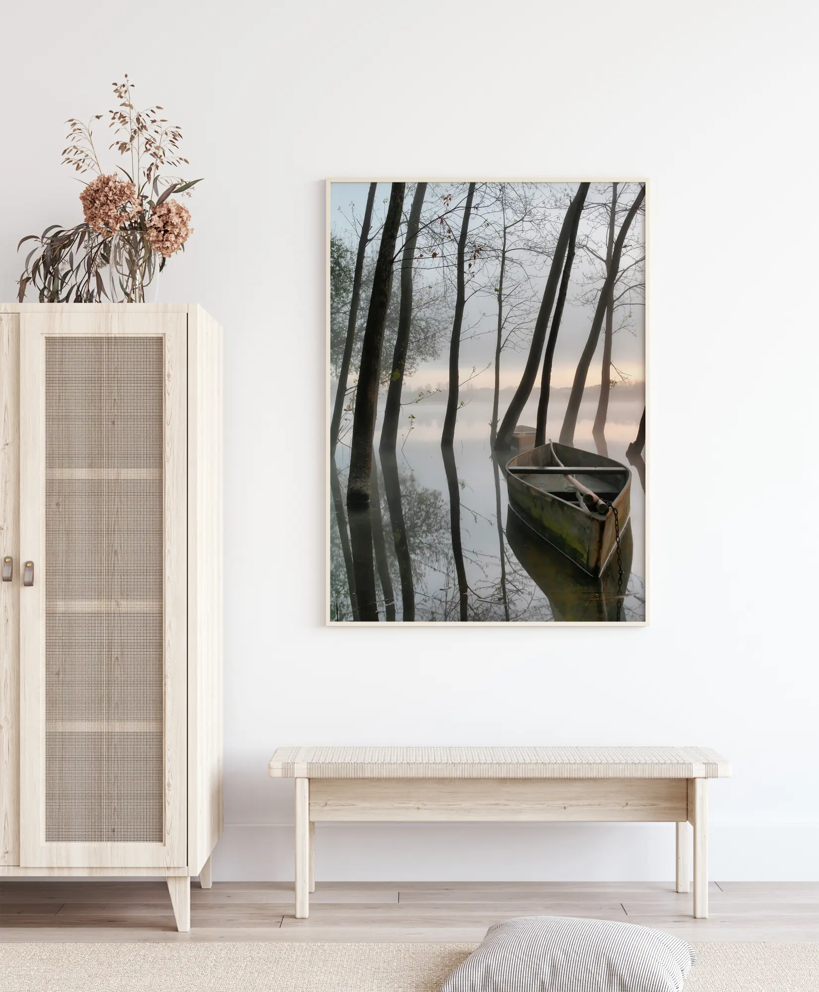 Egy nyugodt poszter egy hajnalról egy tiszta tó felett, ahol fák emelkednek ki a vízből. Egy csónak is kikötve áll a vízben, az orra a fák felé mutat. Minden csendes, tökéletes tükröződésekkel a vízben, miközben a lágy pasztell színű ég fokozatosan világosodik a napfelkeltével. Élvezze ezt a nyugalmat korán reggel.