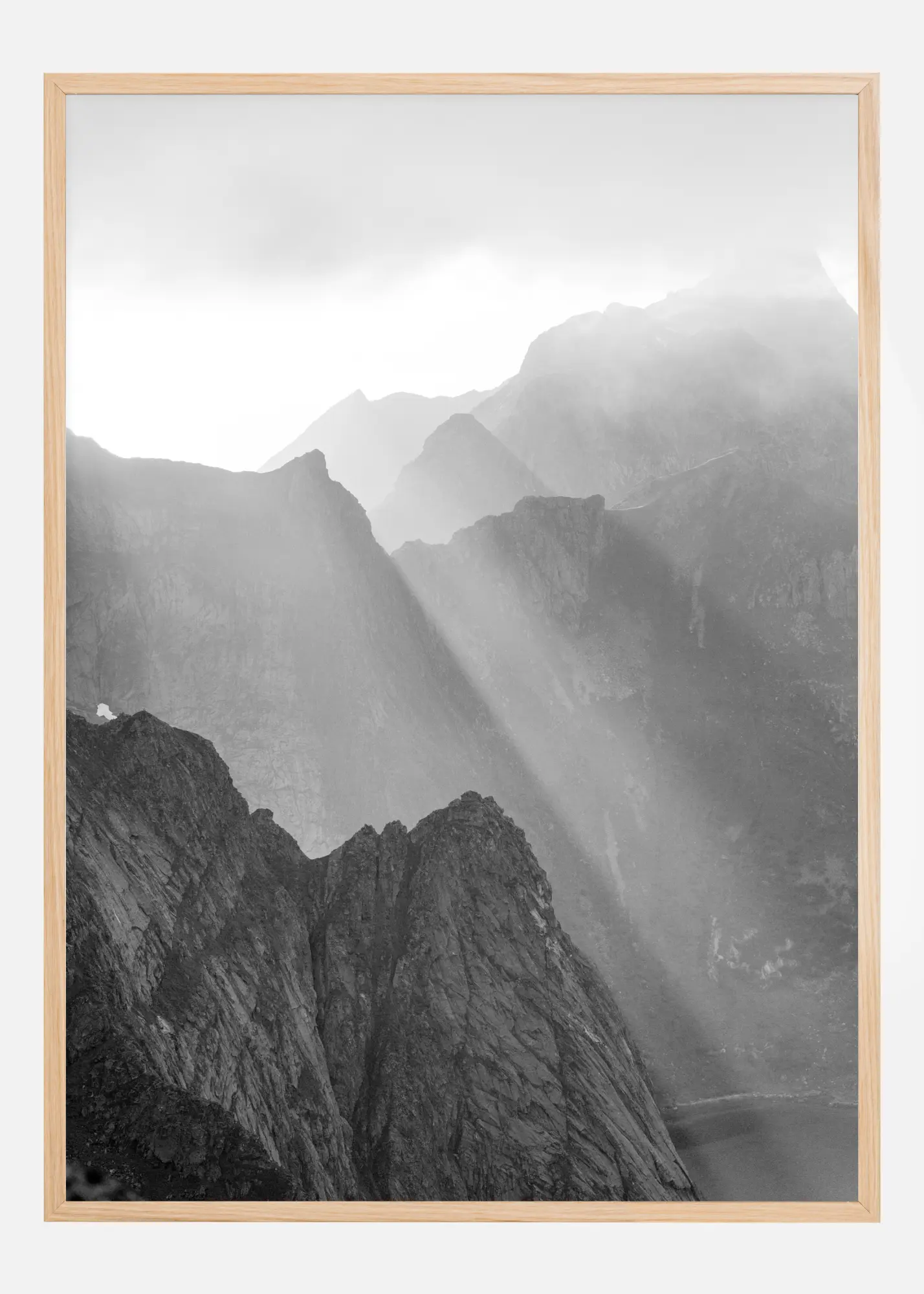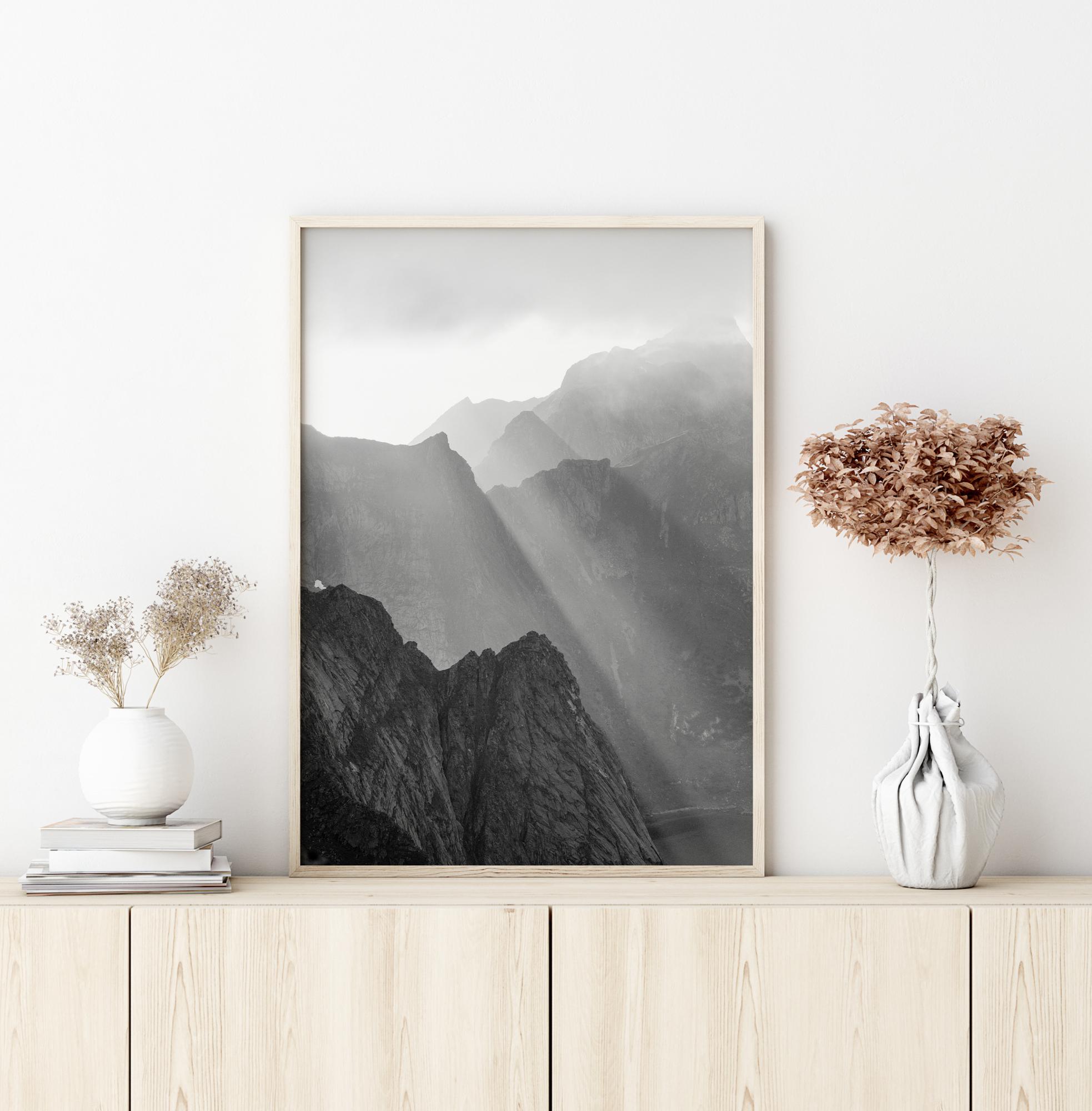 Egy monumentális tájkép poszter, ahol egy erőteljes napsugár világít az ég és a hegyek között. A hegység sötét, dombos formái felemelkednek a ragyogóan fehér égbolt felé, ahol a nap átragyog. Tegye ezt a csodálatos képet a falára egy drámai, mégis varázslatos jelenetért.