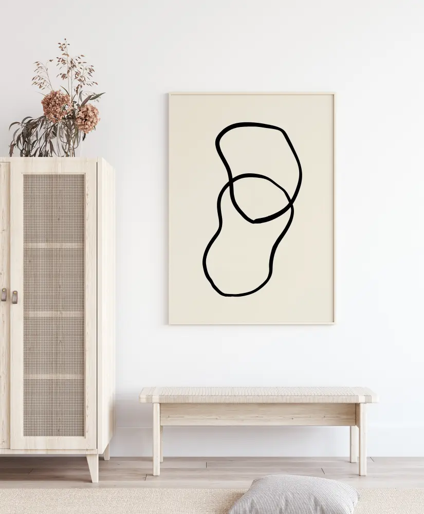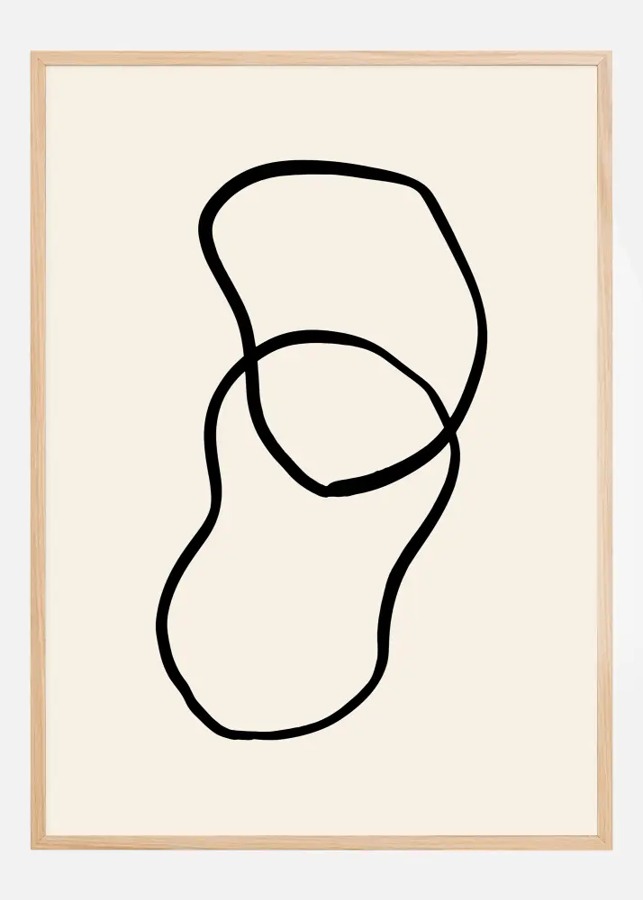 Egy absztrakt poszter két összefonódó formával. Két durva formát erős fekete vonalakkal rajzolnak meg, és keresztezik egymást, hogy egy harmadik formát hozzanak létre. Akassza ezt a vidám fekete-fehér képet egy színes falra, hogy modern művészeti érzést teremtsen otthonában.