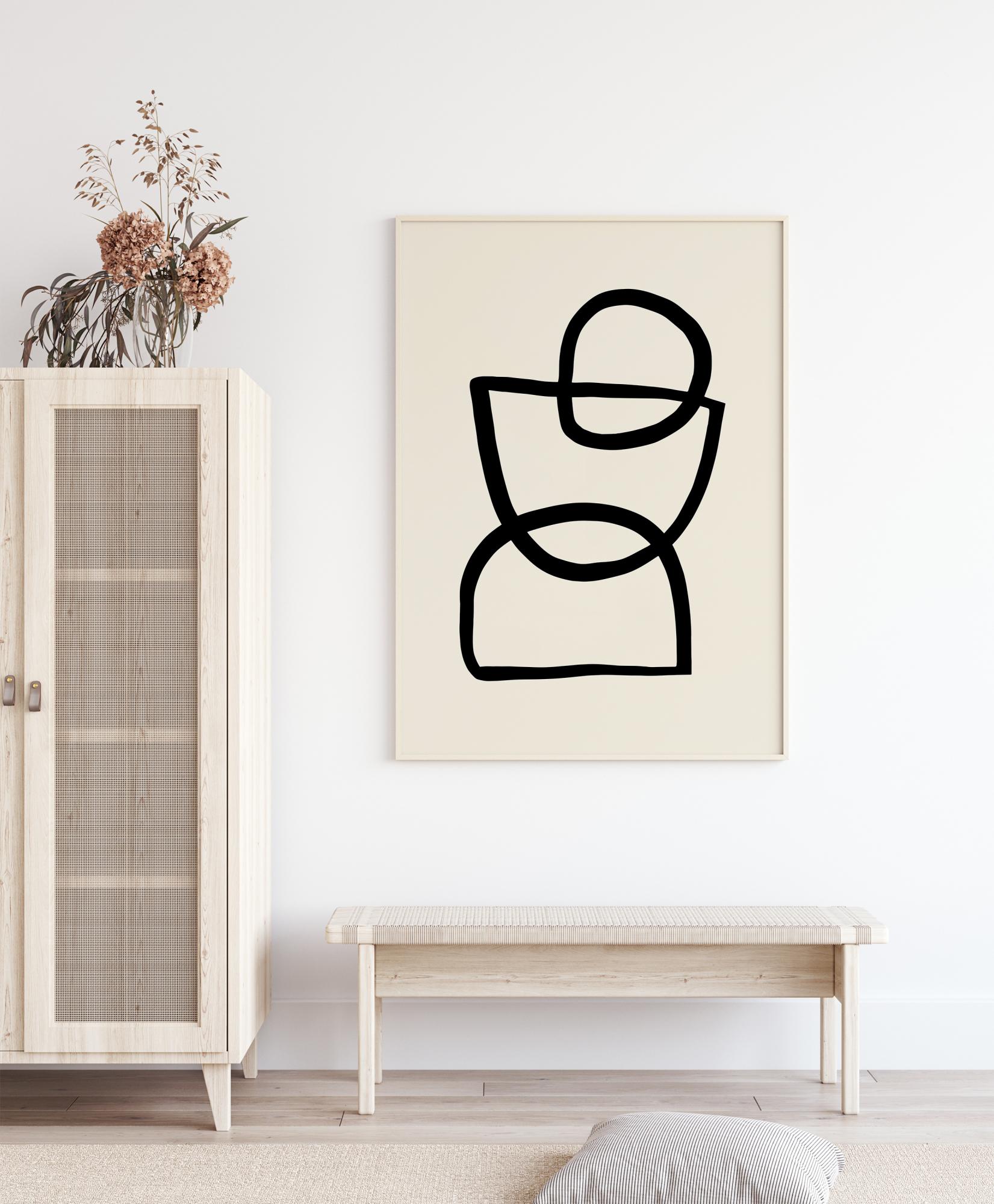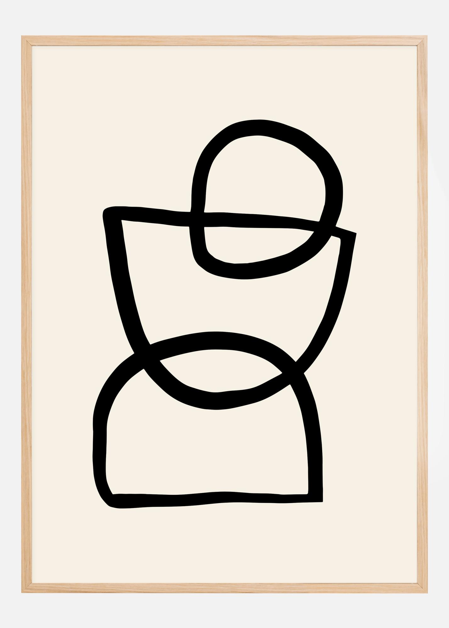 Egy szórakoztató absztrakt poszter három különböző formával, amelyek mindegyike vastag fekete vonallal van rajzolva. Van két félkör, és egy teljes kör a tetején. Ezek átfedik egymást, hogy egy absztrakt dizájnt alkossanak. Akaszd fel otthon, és értelmezd a képet pontosan úgy, ahogy szeretnéd. Egy személy, egy tojástartó vagy egy homokóra? Ez rajtad múlik.