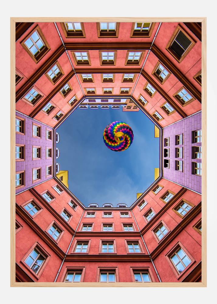 Egy élénk poszter békaperspektívából rózsaszín épületek között a tiszta kék ég felé. Az épületek hat szöget formáznak, amikor felnézel az összes ablakon túlra. A kék ég közepén egy szivárványszínű léggömb lebeg a nyílás fölött. Engedd, hogy a képzeleted ezzel a világos, optimista képpel szárnyaljon.