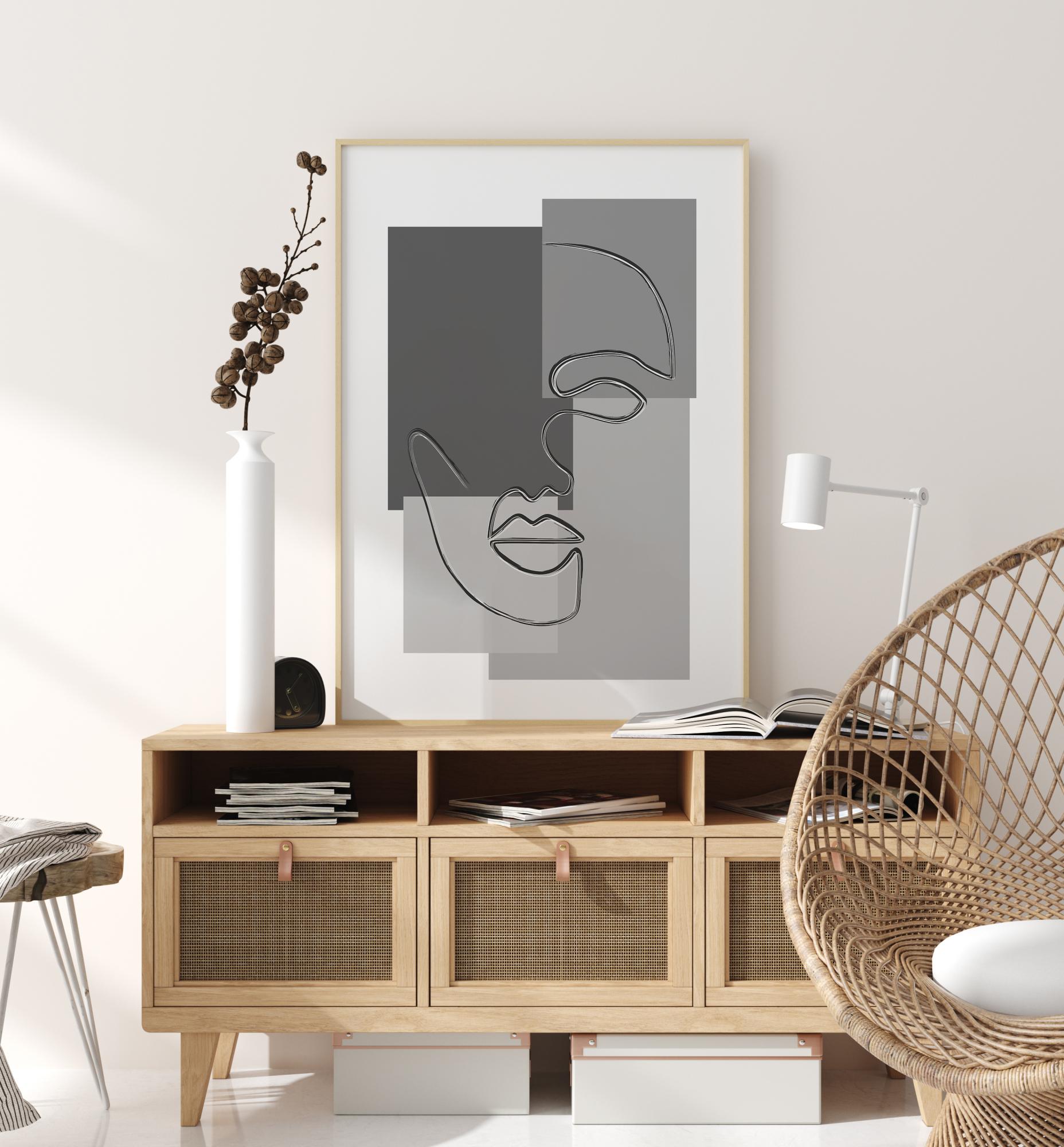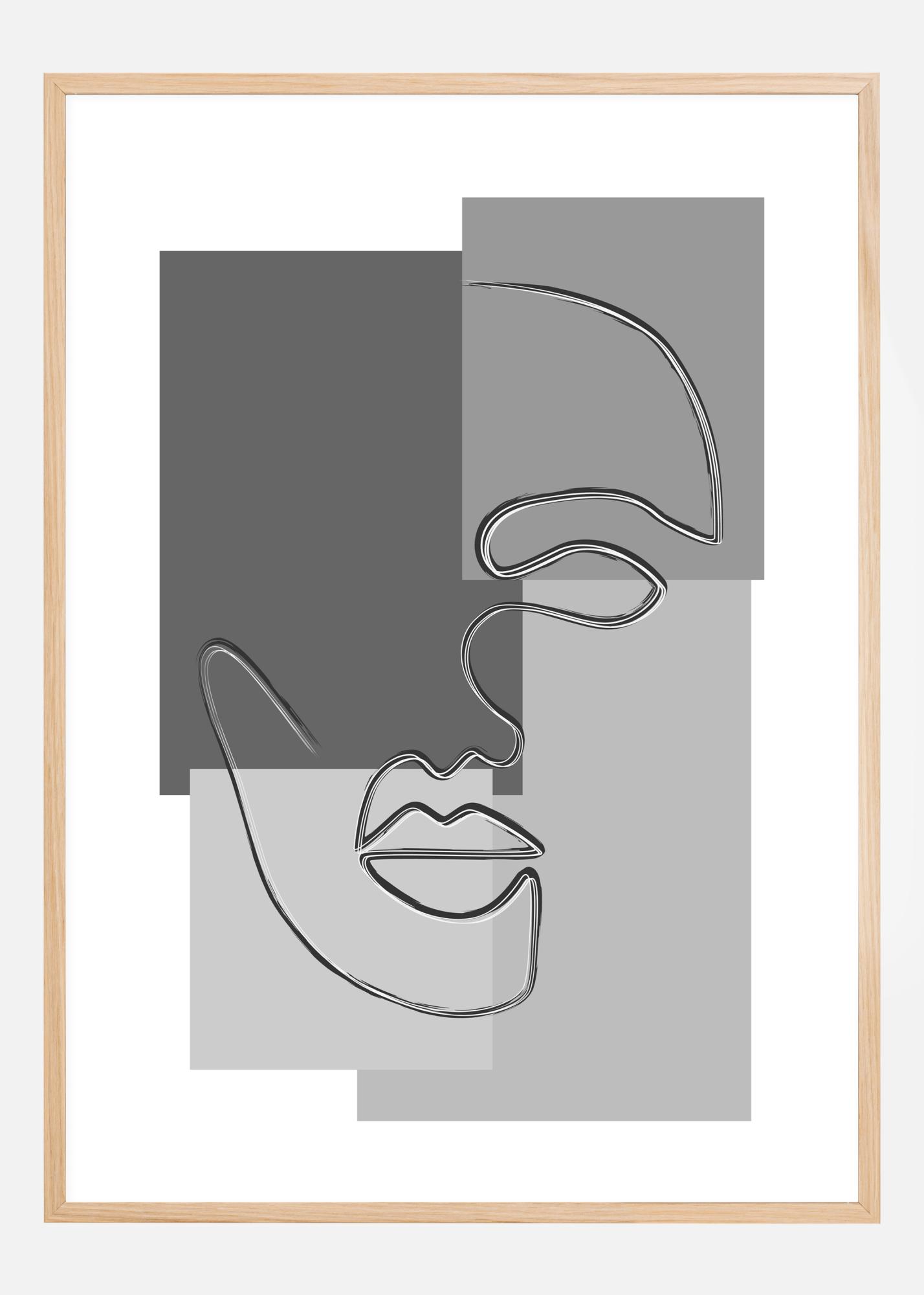Egy absztrakt poszter, amelyen egy arc rajzolódik ki három különböző színű téglalapon. Egyetlen lebegő vonal rajzolja meg az arcot a szemtől kezdve az orron át a szájon át. Az arc négy téglalap tetején helyezkedik el, mind különböző szürke árnyalatokkal a modernebb megjelenés érdekében.