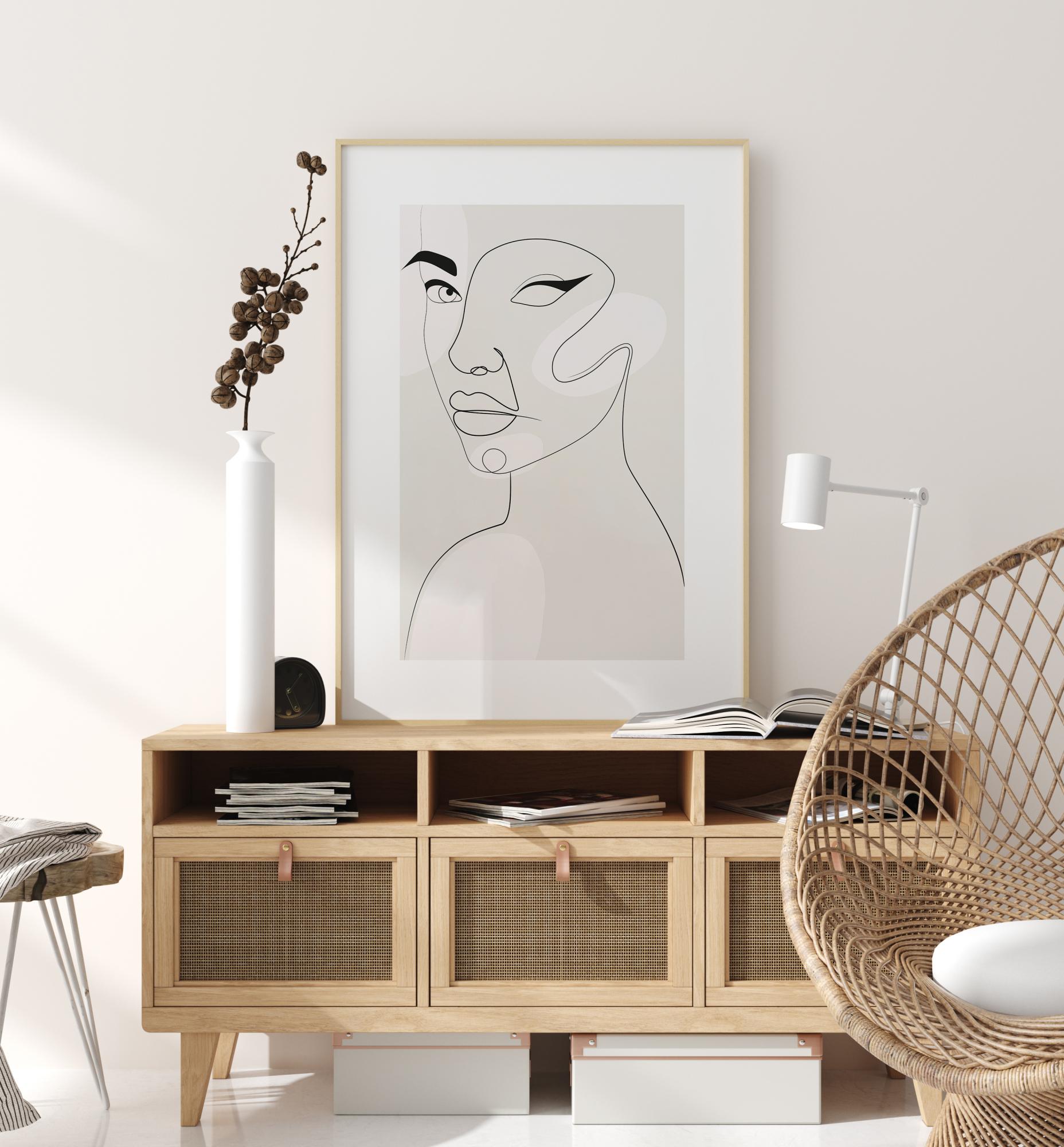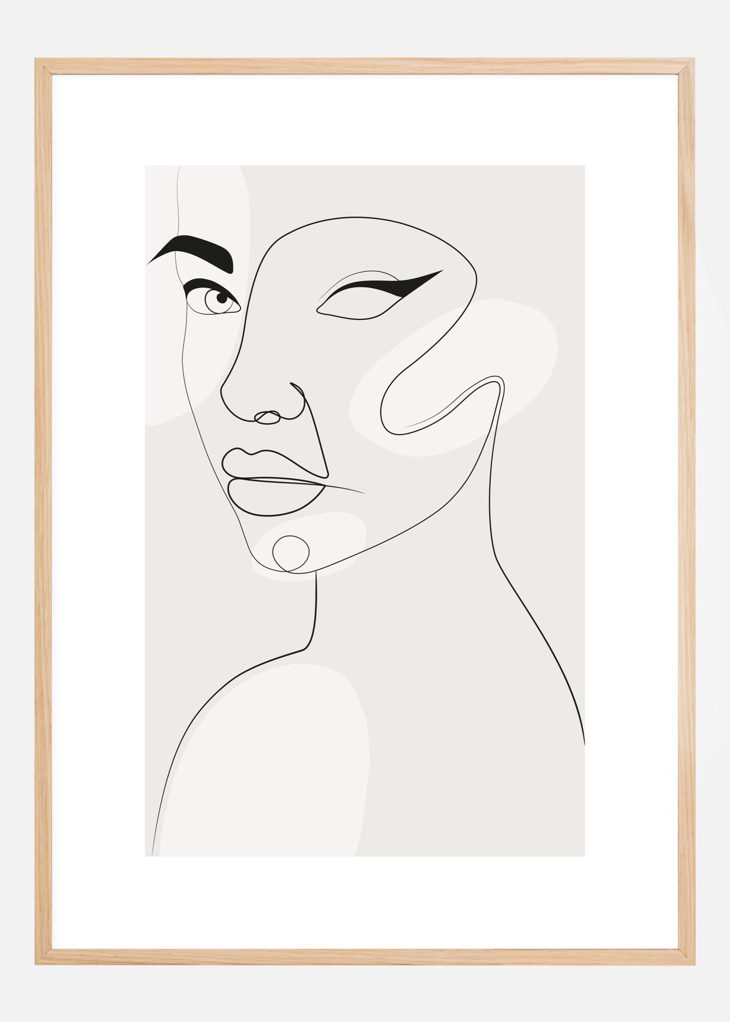 Egy modernista poszter egy absztrakt női arccal. Vékony vonalak örvénylenek az oldalon, hogy megteremtsék az arcát. Egy szeme erős részletekkel bámul rád. A másik félkész, de gyönyörű szemhéjtussal van kiemelve. Felsőbbrendű kifejezést ölt viselője, amikor rápillantasz erre az elegáns, minimalista alkotásra.