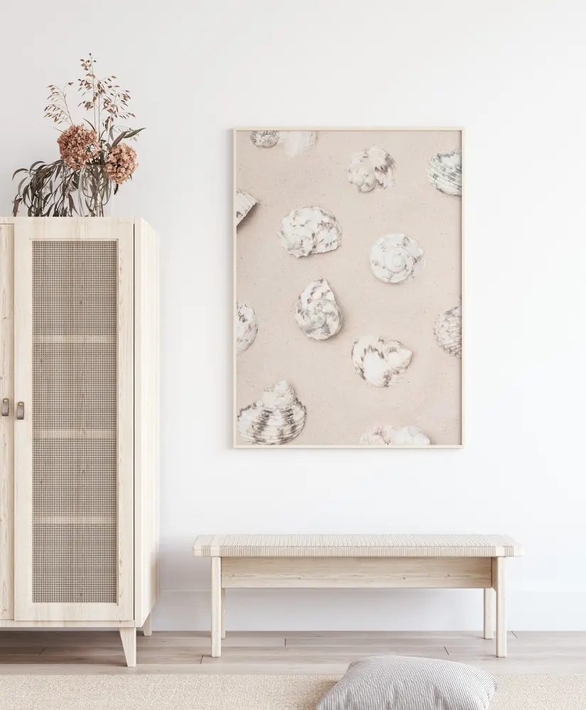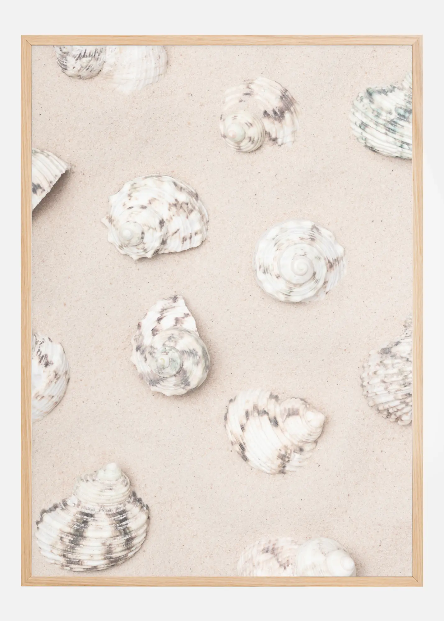 Egy pasztell színű poszter kagylókkal, amelyek világos rózsaszín háttérre vannak rögzítve. Tizenkét csavart kagyló különböző helyzetben áll, egyenletesen elosztva az egész képen. Minden kagyló fehér és barna, ami nagyon lágy képet ad, amely tökéletes kiegészítő minta egy egyszerű falra.