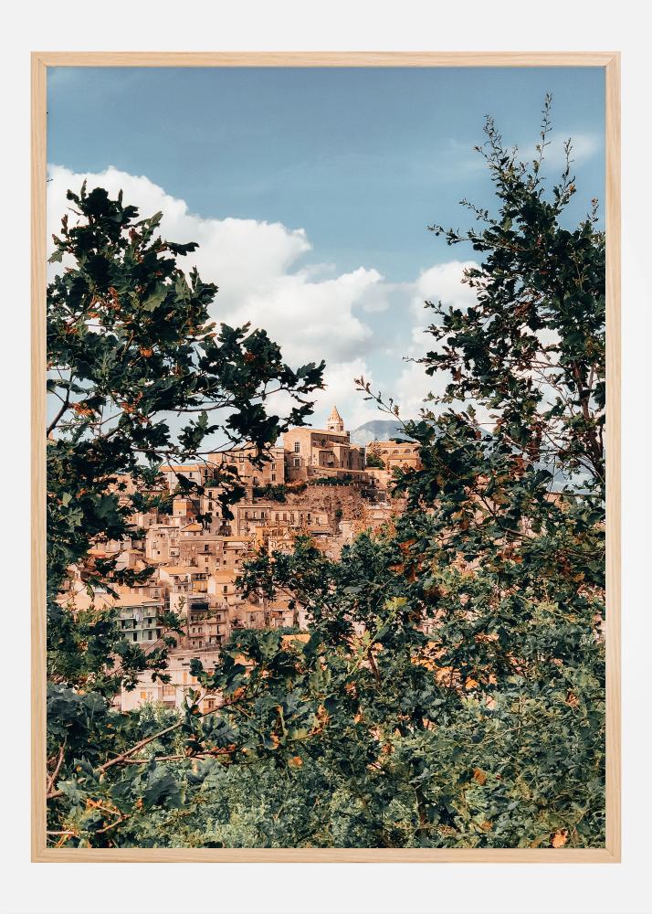 Ez a részletgazdag poszter vonzza a tekintetet egy középkori város élénk látképével, amely felfelé kapaszkodik egy felhős és kék ég felé. A város Szicília szívében helyezkedik el, gazdag történelemmel és kulturális örökséggel, ami látszik a meleg tónusú épületeken és a történelmi templomtornyokon. Dús lombkoronával körülvéve ez a poszter azt az érzést kelti, mintha felfedeznénk egy rejtett gyöngyszemet, egy helyet, ahol minden kő és tető egy történetet mesél.