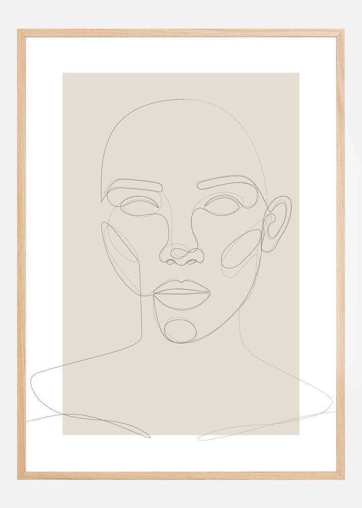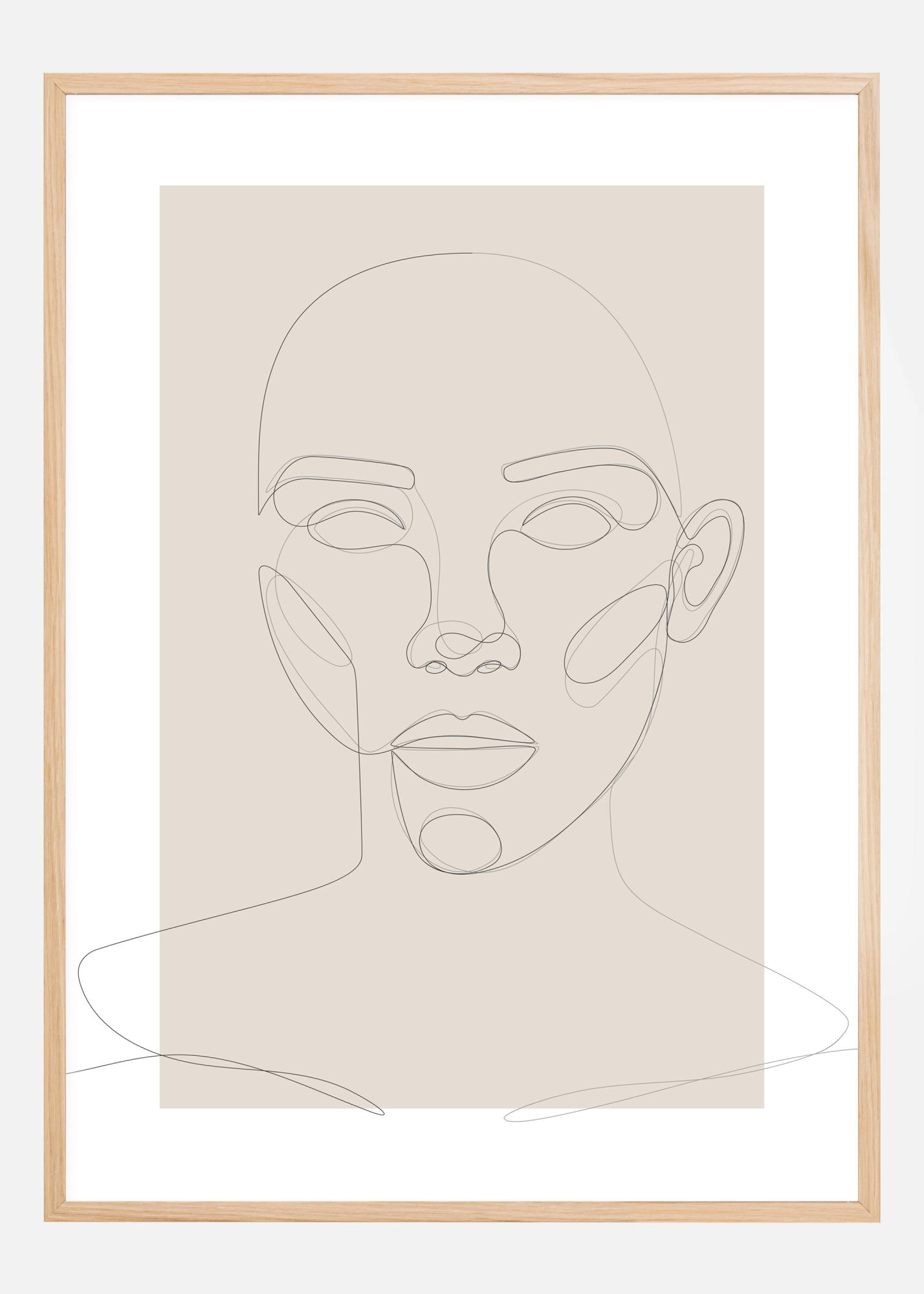 Egy egyszerű absztrakt poszter egy arccal, amelyet vékony vonalakkal hoztak létre. Az arc egyenesen előre néz, és egyetlen hosszú, folyékony vonallal készült, amely a teljes arc fő jellemzőit lenyűgöző módon mutatja be. Ez a kép szürke háttérrel készült, és semleges falon mutat a legjobban.