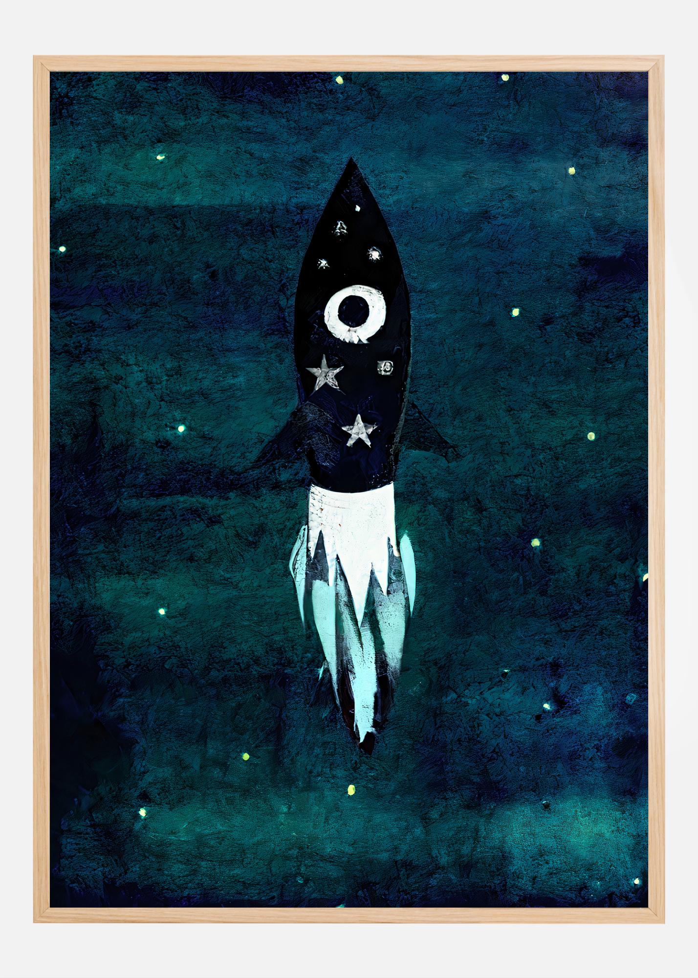 Emelj ki egy csillagos fantáziát ezzel a poszterrel, amely egy színes univerzumon keresztül felfedező úton lévő rakétát ábrázol. A mélyen telített kék háttér világító pontokkal van teli, amelyek csillagokra emlékeztetnek, és a végtelen tér illúzióját keltik. Maga a rakéta, ezüst csillagokkal és a Holddal díszítve, az űrutazás és az ismeretlen felfedezése iránti emberi álom szimbólumává válik.