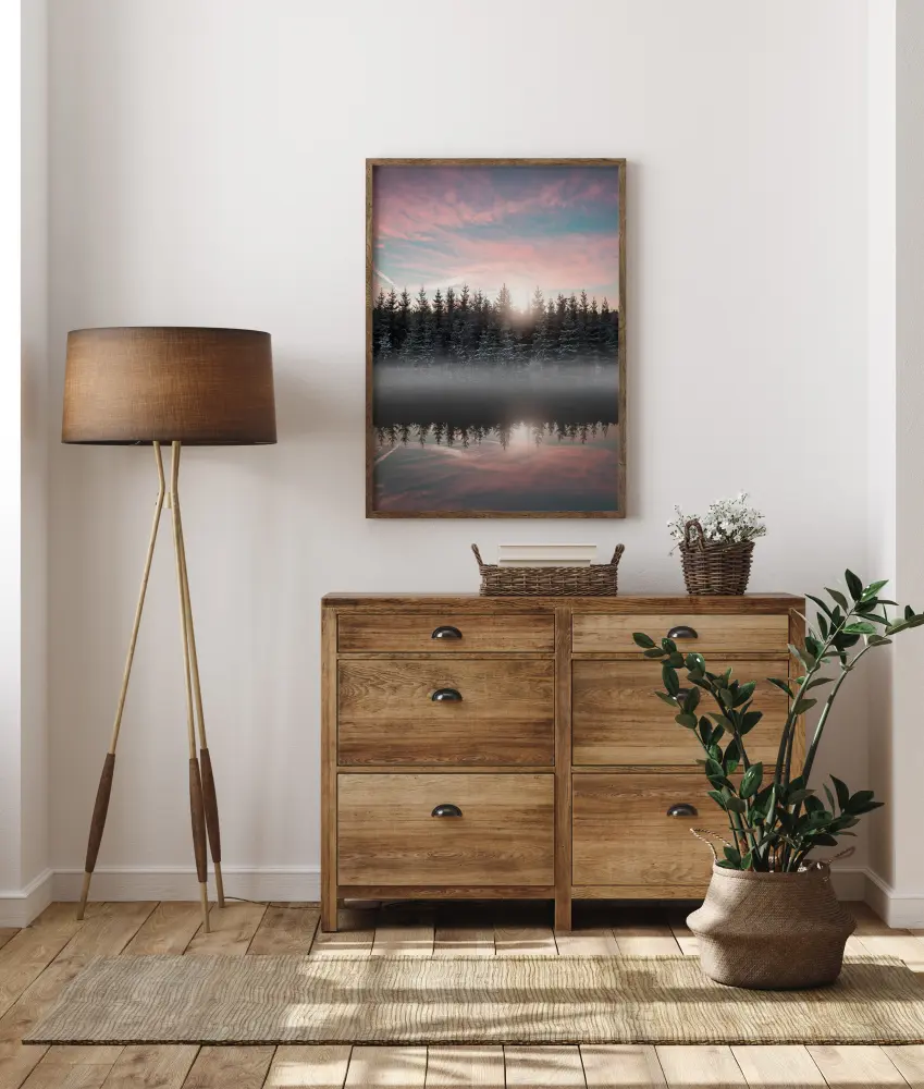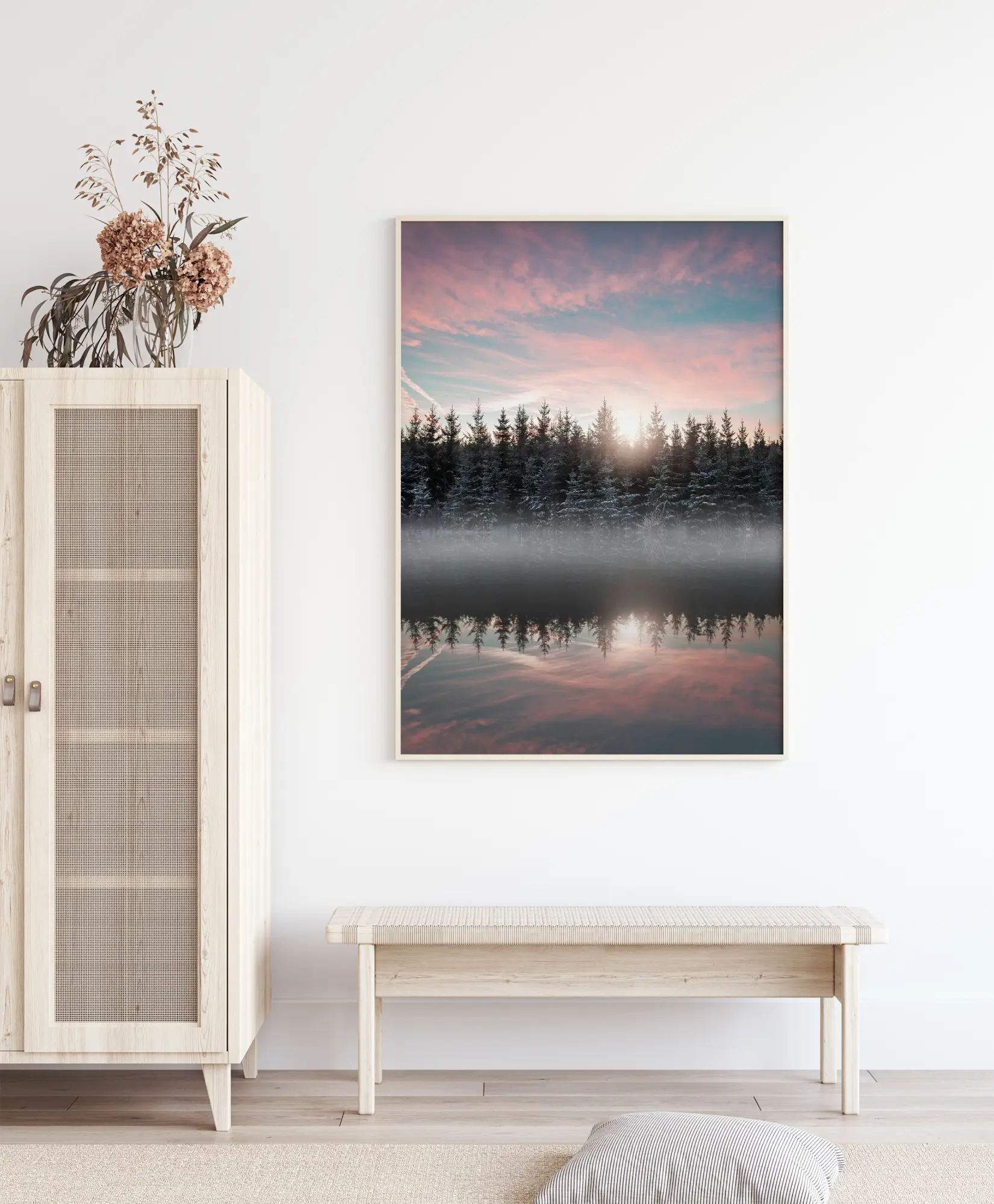 Egy varázslatos poszter, amely egy ködös tó ábrázol a kora reggeli fényben. Hófödte fák állnak a parton, részben köd fedésében. A fák tükröződnek a tó lágy pasztellszíneiben. A fák fölött felkel a nap, és gyengéd fényt vet a rózsaszín és kék égre, nyugodt légkört teremtve.