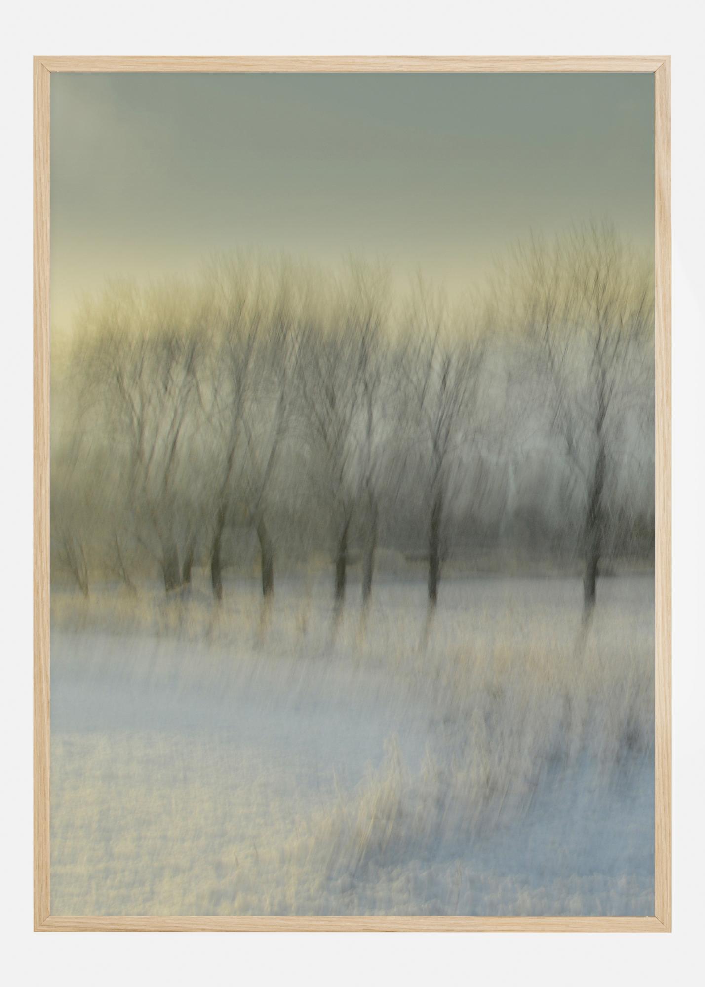 Egy fantasztikus plakát motion blur-stílusban, fákkal téli háttéren. Fehér hó borít mindent ezen a lágy, fókuszálatlan képen. A fák elmosódottak, csak magas fekete törzsek látszanak, és egy lágy sárga sáv lebeg a fák teteje fölött. A varázslat szinte a levegőben van.