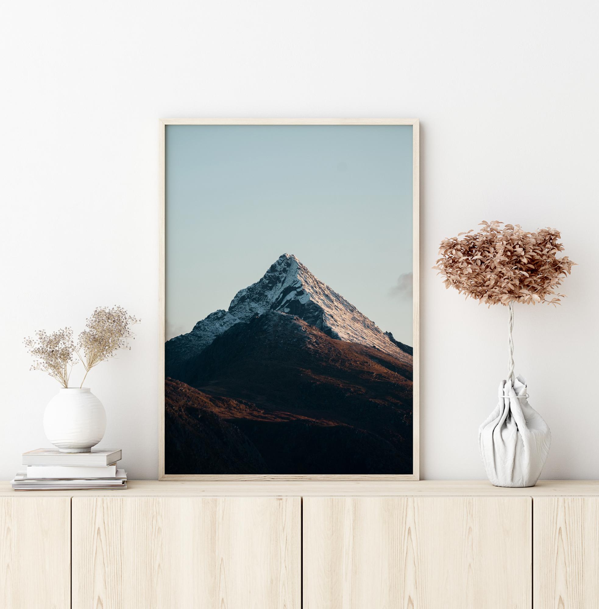 Egy erőteljes poszter egy magányos hegycsúccsal, amely magasra emelkedik a tiszta és világos égbolt ellen. A hófödte csúcs szinte tökéletes háromszög, amely drámai módon vonzza a tekintetet a csúcsra. A hűvös hőmérséklet érezhető ezen a lenyűgöző képen.