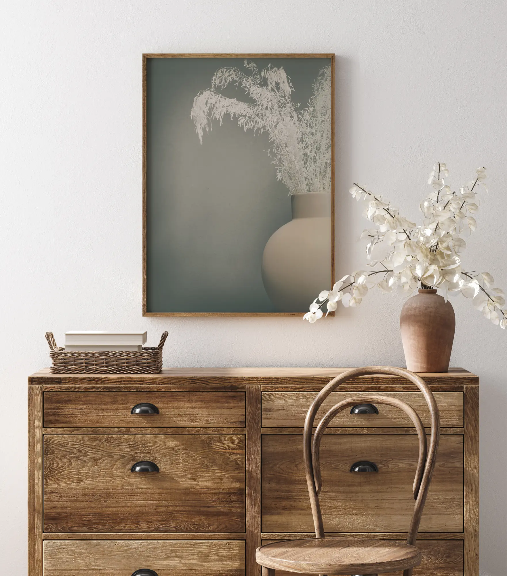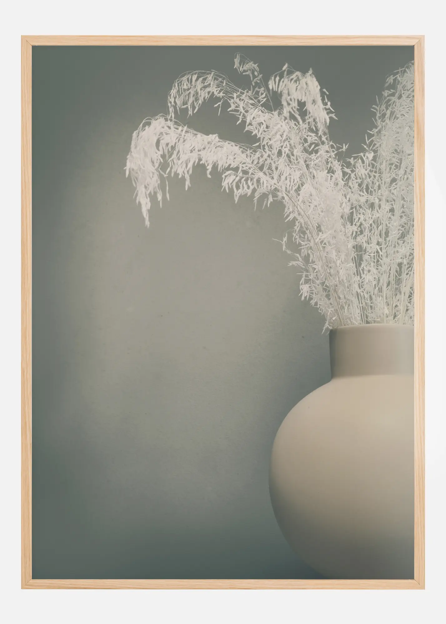 Egy poszter egy fehér vázával, amelyen néhány puha rojt található, amelyeket egy világoskék-szürke falra rajzoltak. A váza a kép jobb oldalán áll, és a fehér rojtok finoman lógnak le, ami igazán lágy érzést kelt. A puha pasztellszínek nyugtatóak és békések.