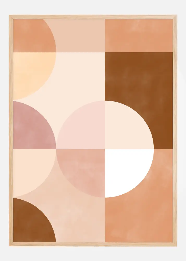 Ez a poszter a geometria és a színek harmóniájának stílusos dicsérete. A motívum finom, mégis megragadó kompozíció átfedő körök és négyzetek révén, amelyek változatos palettája lágy rózsaszín árnyalatokból áll, kiegészítve merészebb terrakotta és mély barna tónusokkal. Ez a formák és színek kombinációja dinamikus egyensúlyt teremt, amely mind nyugtató, mind vizuálisan vonzó. Tökéletes azok számára, akik értékelik a lágy és hívogató esztétikát a belső terekben, ez a nyomat egy kifinomult kiegészítés, amely bármely szobát felvilágosíthat.