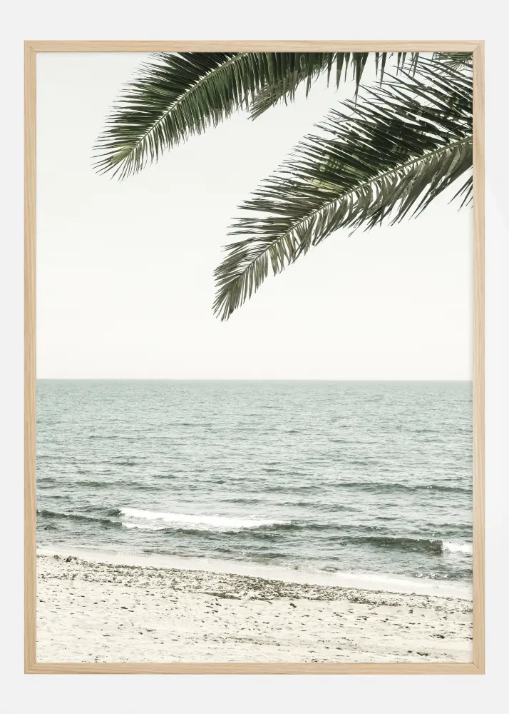Tapasztalja meg egy trópusi menedék nyugodt atmoszféráját ezzel a poszterrel, amely megragadja a lengedező pálmalevelek látványát a tiszta kék égbolt és a csendes tenger előtt. A megnyugtató tengerparti jelenetet az élénk zöld levelek keretezik, természetes ablakhatást keltve és meghívva a szemlélőt, hogy álmodja magát melegebb szélességi fokokra.