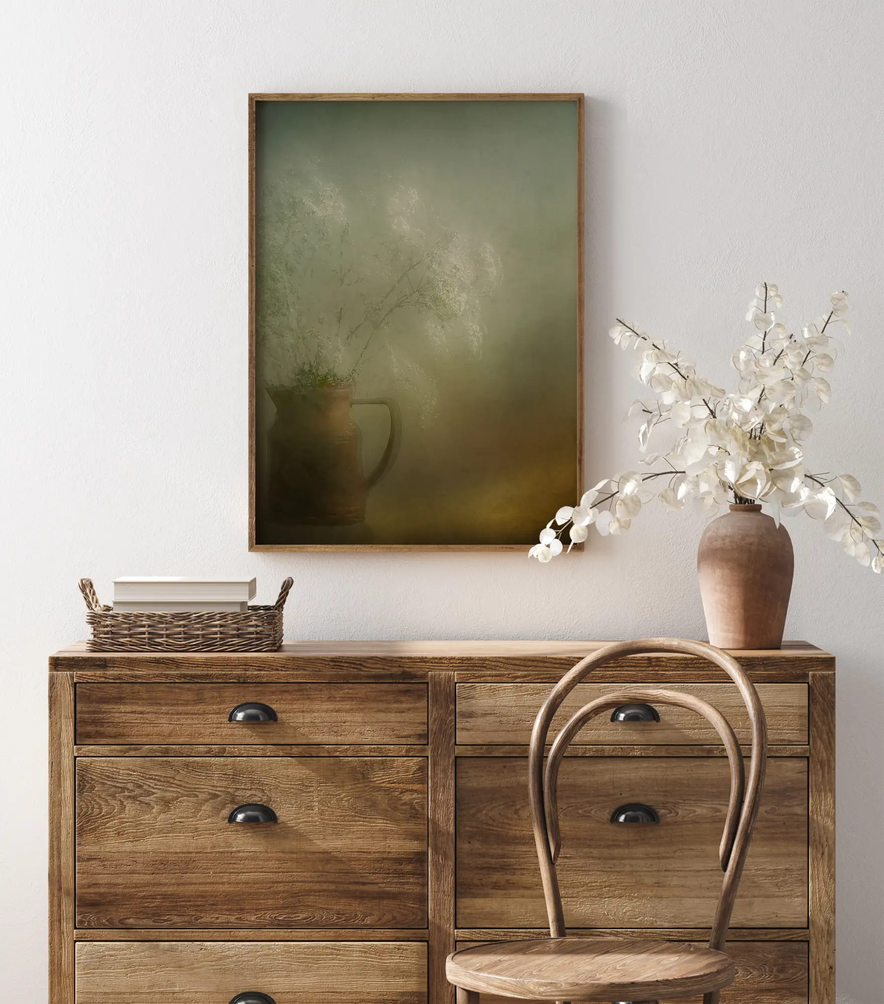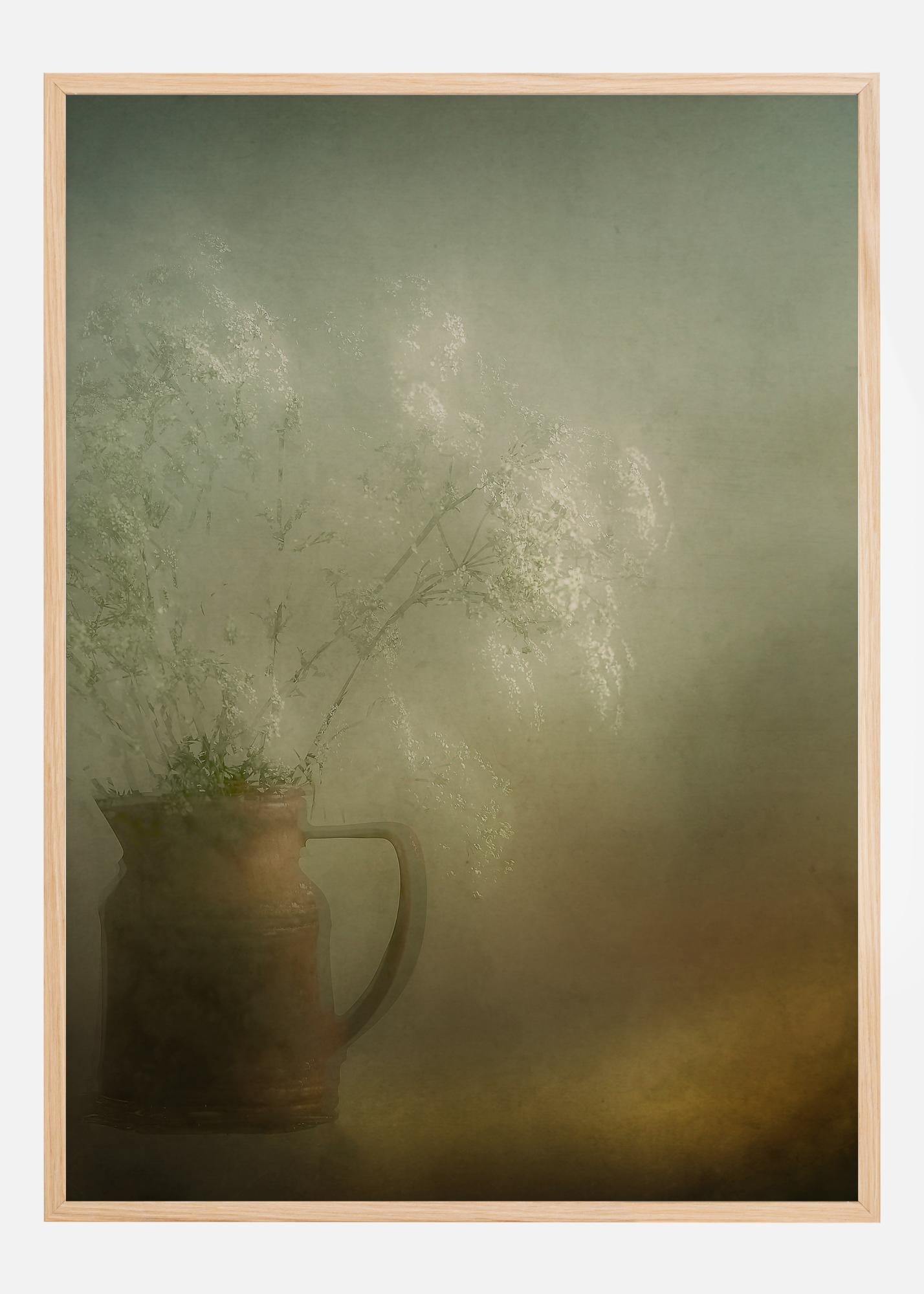 Egy festői csendéletposzter egy barna agyagkancsóval, tele lágyan lebegő fehér virágokkal. Ez a tavaszi csokor felhőszerű természetű, és szinte eltűnik a háttérben lévő lágy szürke fal előtt. Egy narancssárga fény melegséget kölcsönöz a kép alapjának, ahol a kanna áll.