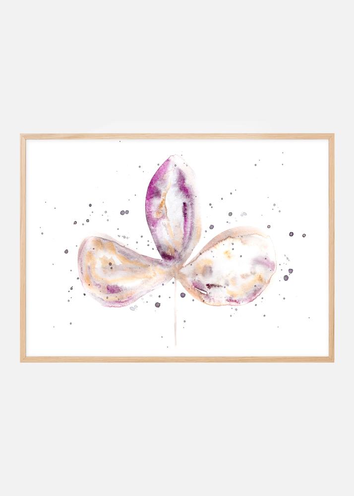 Egy világos poszter, amelynek közepén három lila szirom található fehér háttéren. Különböző lila árnyalatok alkotják ezeket a puha, kiterjedő leveleket. Lila színű pontok terjednek szét a levelekből, ami absztraktabb érzetet kelt. Emeld ki a színeket, ha egy lila falra akasztod.