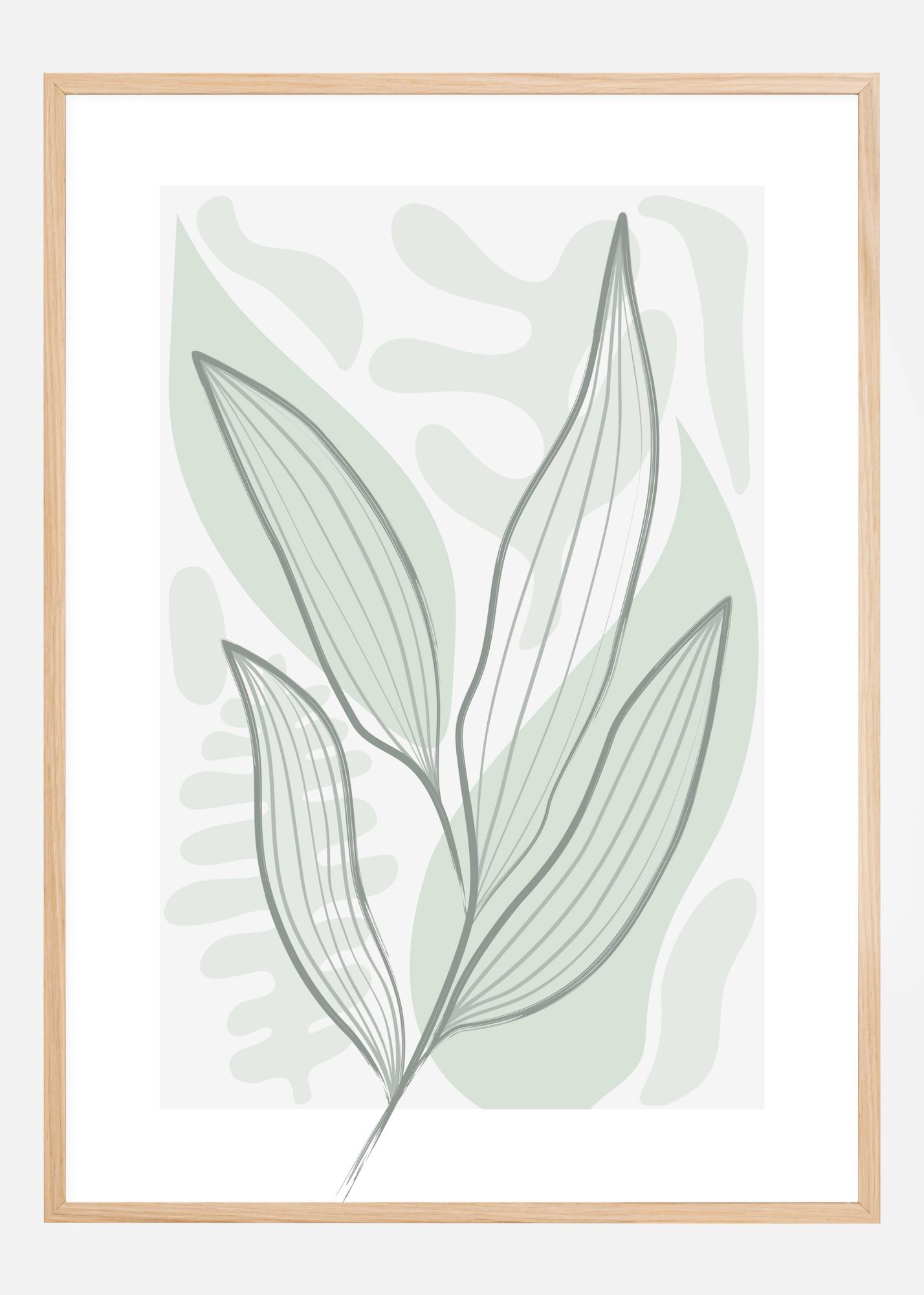 Egy absztrakt poszter levelekkel egy egyszerű zöld háttéren különböző levélformákkal és mintákkal. Lágy zöld és szürke színekkel az egyszerű levélminta, amelyet egy erős szürke vonal határol, erős, de lágy tavaszi hangulatot ad, amely bármelyik szobában felakasztható az otthonban.