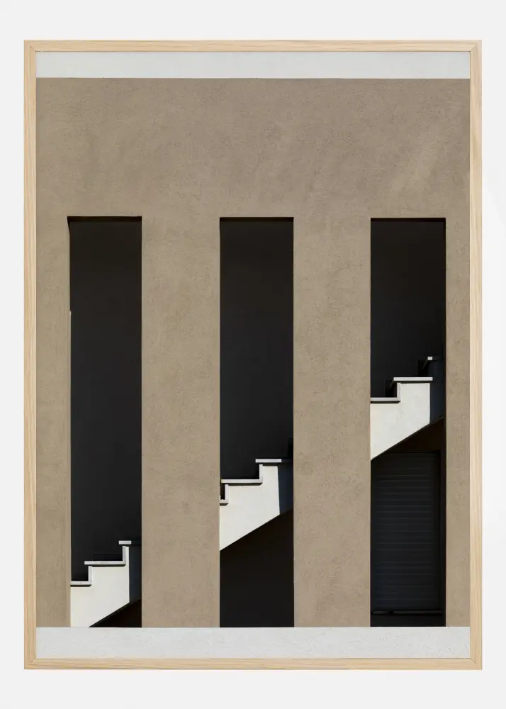 Egy városi környezetben készült poszter lépcsőkkel, amelyek nagy ablaknyílások mögött emelkednek. Egy lenyűgöző absztrakt kép, ahol a geometriai formák rendérzetet keltenek ebben a drámai képben. Ez a kép művészi hangulatot kölcsönöz otthonának.