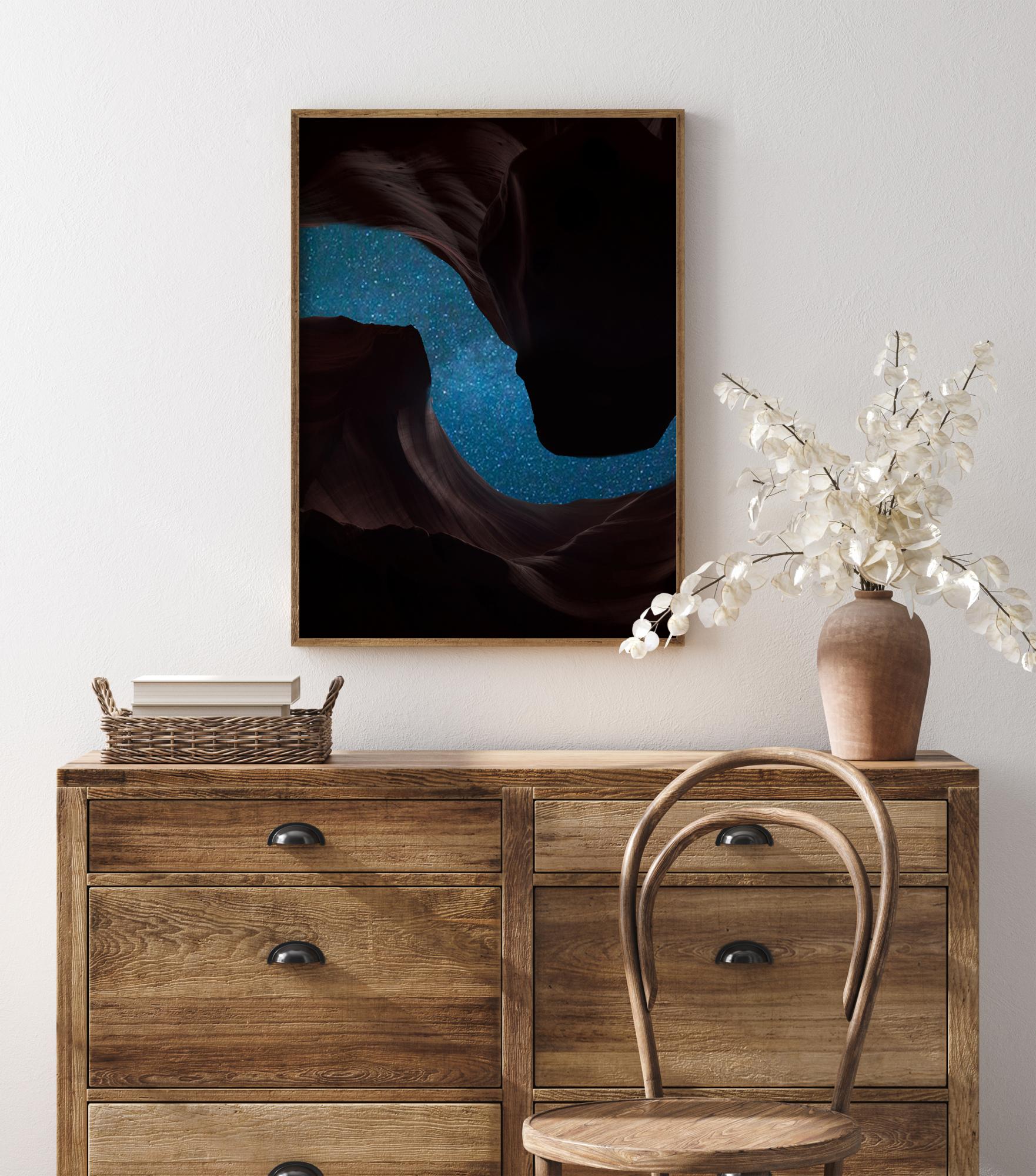 Egy nagyszerű éjszakai poszter csillagos égbolttal, amely néhány drámai sziklaalakzat között jelenik meg. A mélyvörös sziklák körben forognak a fotó tetején és alján, és csillagos utat teremtenek az éjszakai égboltnak, hogy átragyogjon ezen az élénk képen, amely tiszteletet vált ki.