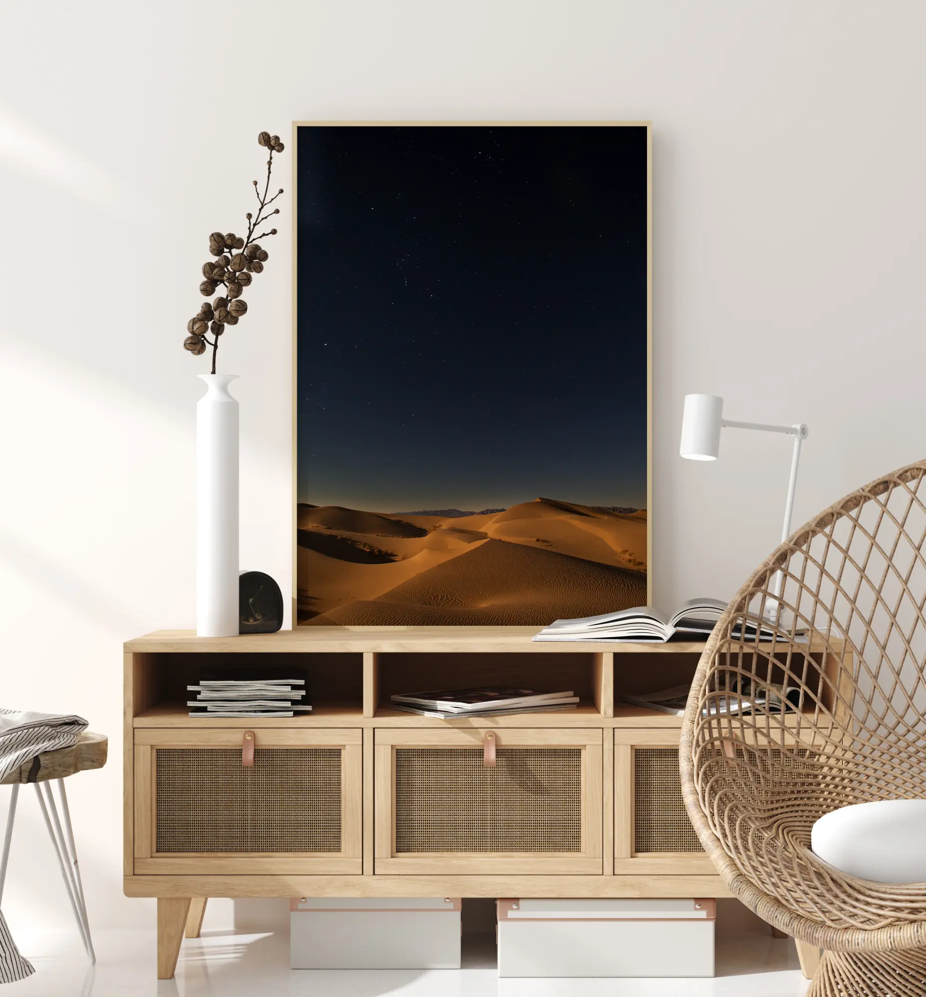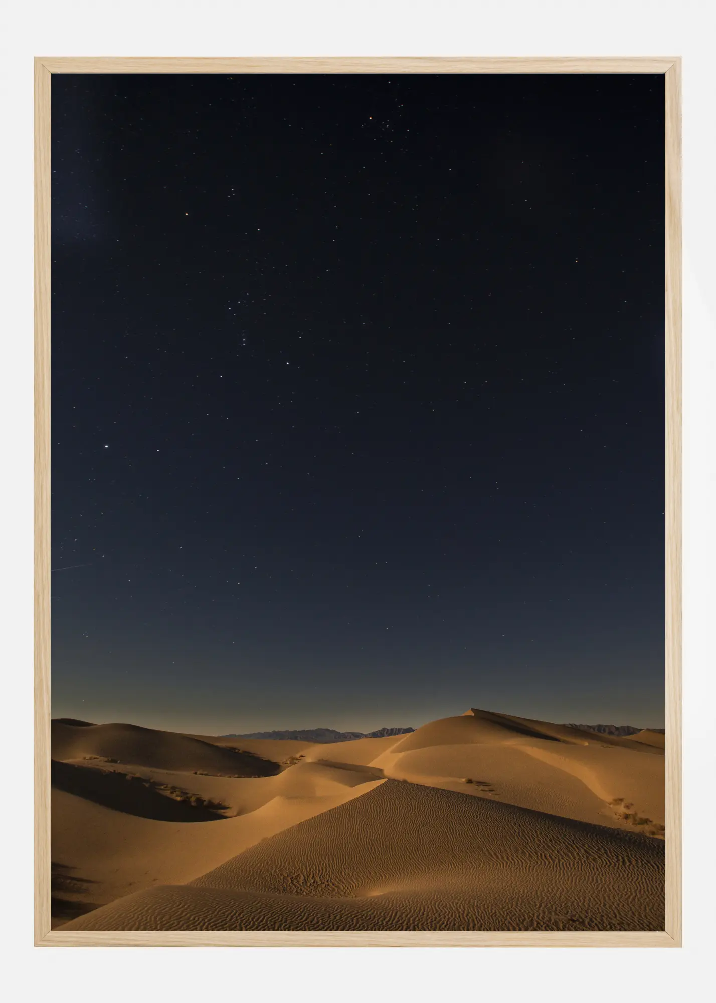 Egy szuggesztív poszter az éjszakai sivatagról. Puha aranysárga homokdűnék terjednek a távolban a kép alján. A homok fölött hatalmas sötétkék ég terül el puha csillagokkal, amelyek szétterülnek rajta. Teremtsen térérzetet, amikor ezt a posztert otthon kiakasztja.