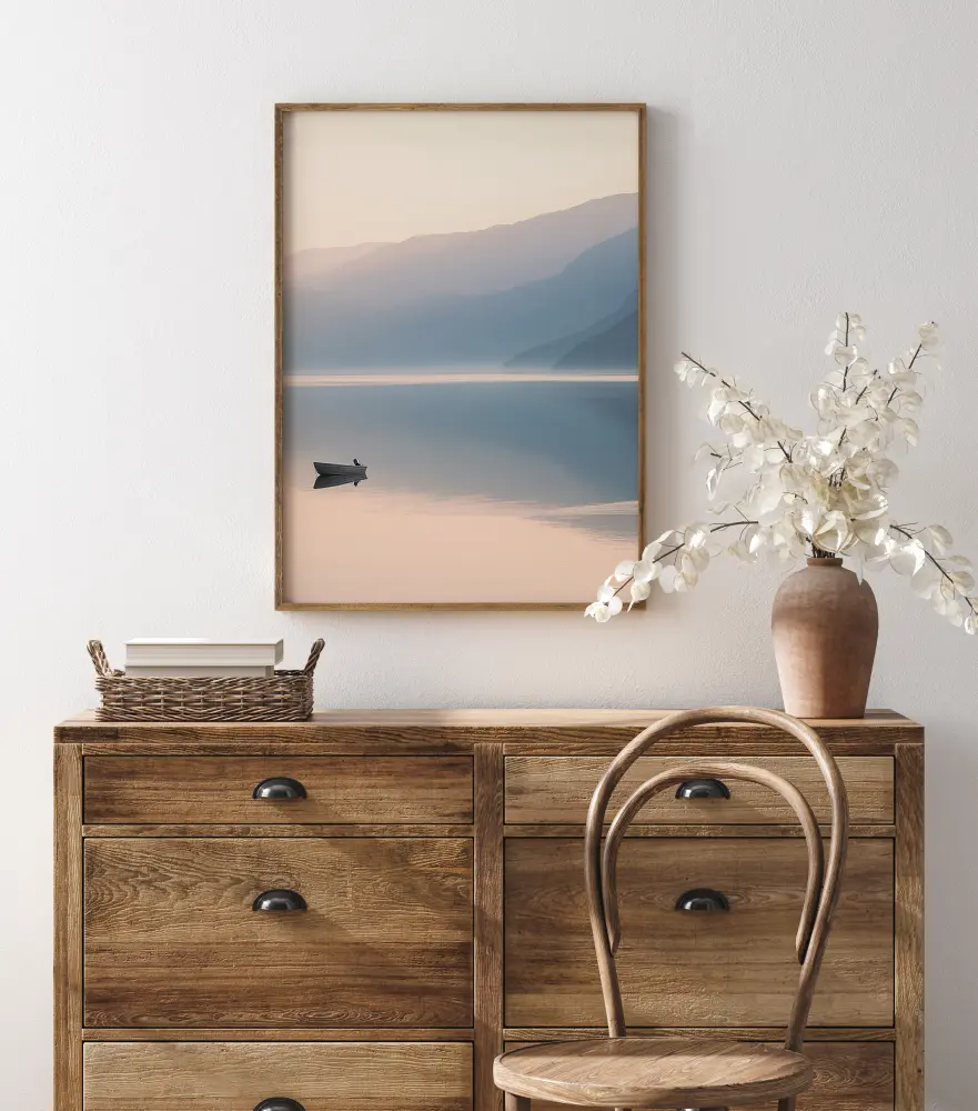 Egy békés poszter egy csónakkal egy nagy tó közepén. Ez az esti kép csupán nyugalom. Egy csendes tó tükrözi a hegyek mögötti pasztellkéket, hogy csendet és pihenést teremtsen, ami az otthonodba is áthatol.