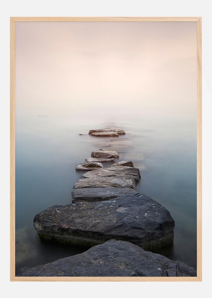 Egy éteri poszter kövekkel, amelyek egy tón át vezetnek az ismeretlenbe. Nagy kövek vezetnek el egy ködös világba túl. Puha kék és rózsaszín színek töltik meg ezt a képet egy lágy, varázslatos érintéssel. Tedd meg az első lépést, és nézd meg, merre visznek a lábaid.