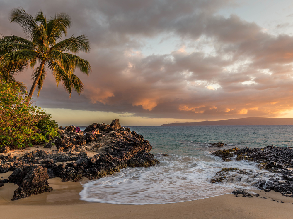 Egy strand naplementében, egy gyönyörű klisé, amely kötelező a tiki őrülteknek vagy a trópusi témához. Poszter a klasszikus pálmafával, amely a nap utolsó arany sugarainál a part fölé hajol. A fénykép jól mutat egy időjárásálló megjelenésű képkeretben vagy egy erős színben, hogy illeszkedjen a tiki bútorokkal.