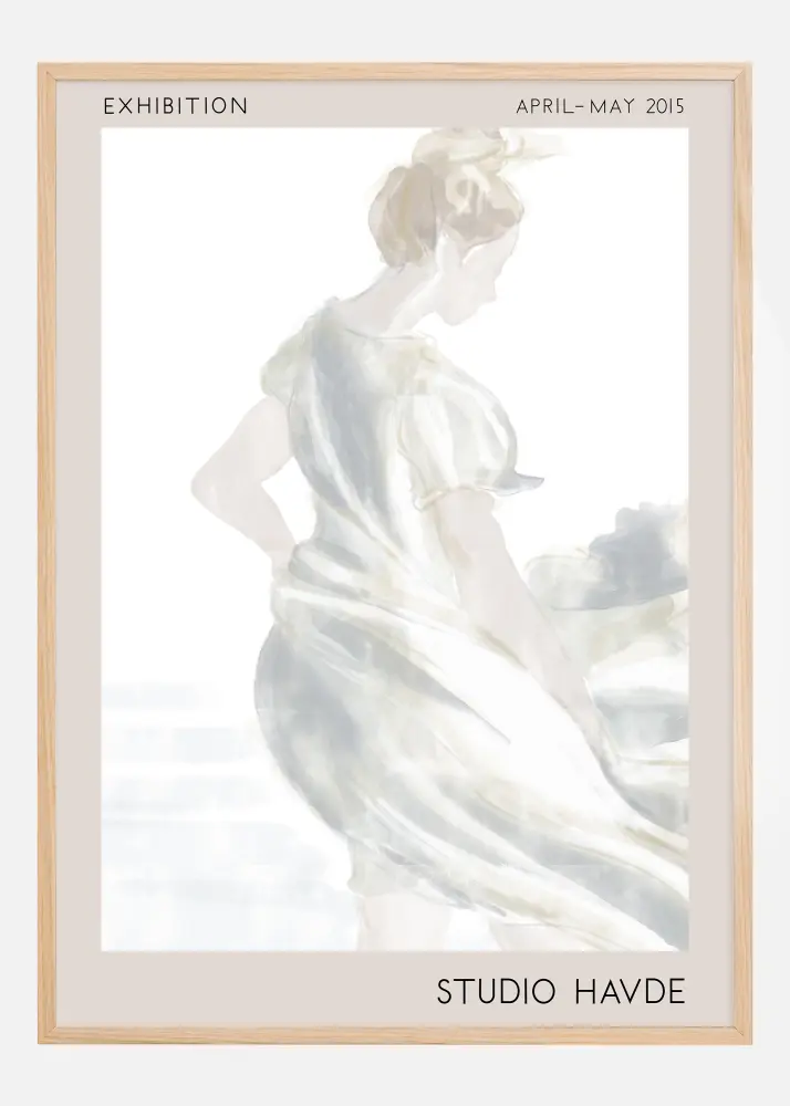 Ez az elegáns és légies poszter a Studio Havde 2015 április-májusi kiállításáról a könnyedség és mozgás lényegét ragadja meg. Az illusztráció egy női alakot ábrázol, amelyet lágy, akvarellszerű ecsetvonásokkal festettek, miközben kecsesen mozog a vásznon. A színei visszafogottak és harmonikusak, halványkék, krémfehér árnyalatokkal és arany árnyalattal, amelyek együtt időtlen szépség és elegancia érzését keltik.