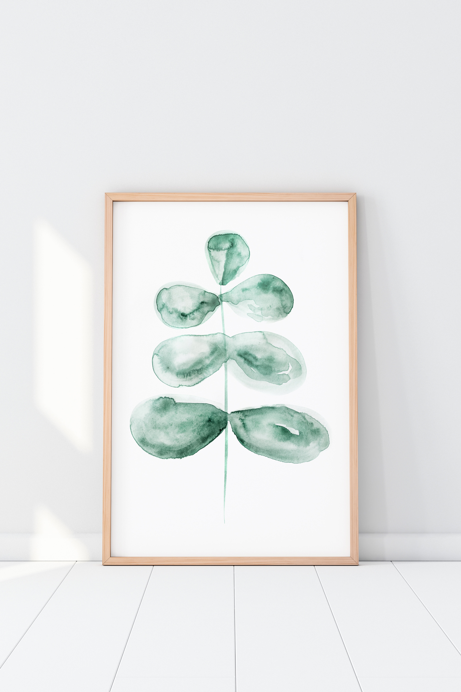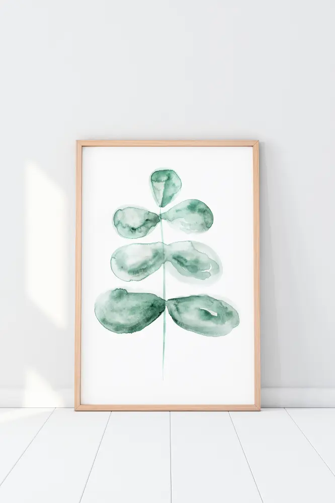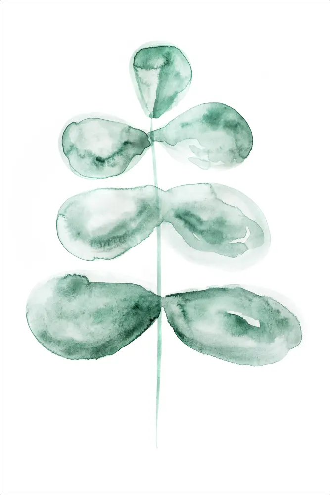 Egy egyszerű poszter kékeszöld levelekkel, amelyeket akvarellekkel festettek. A szín kiterjed minden egyes levélen, és a szélek lágyak és elmosódottak maradnak, hogy festői megjelenést nyújtsanak. Egy vékony szár köti össze a leveleket egy koherens egésszé ebben az elegáns festményben. Párosítsd lágy pasztellszínekkel, hogy teljessé tedd a nyári hangulatot.