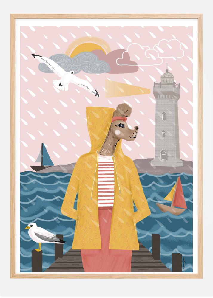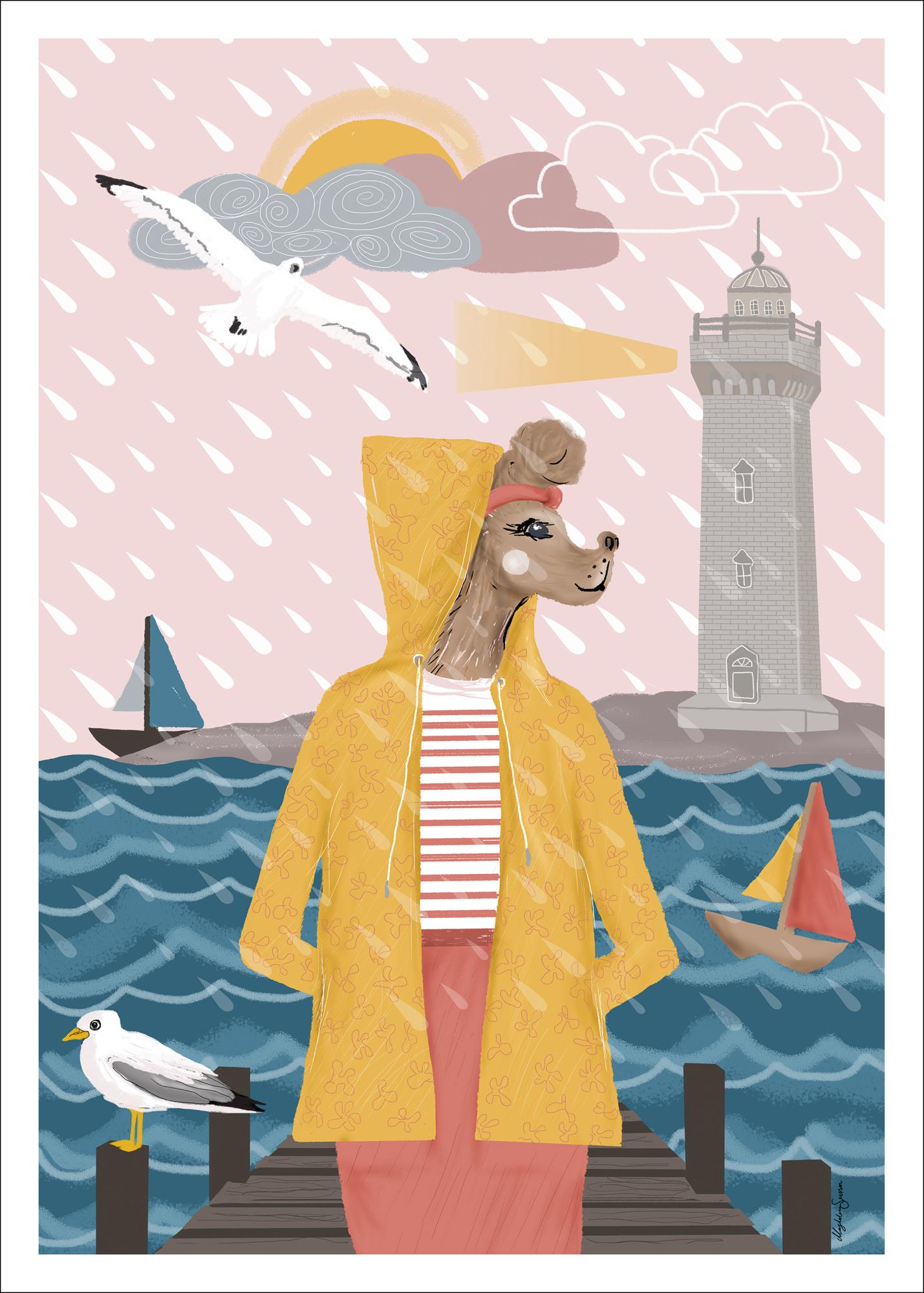 Poszter kivágott stílusban, egy aranyos uszkárral, amely sárga esőkabátot visel az esőben. Egy mólón áll, szemben a kicsi, hullámzó kék hullámokkal. Egy világítótorony van mögötte, két hajó úszik el mellette, és egy sirály repül fölötte. A nap éppen kibújik a felhők mögül, készen arra, hogy mindent felszárítson ebben a mesekönyv stílusú, vidám képen.