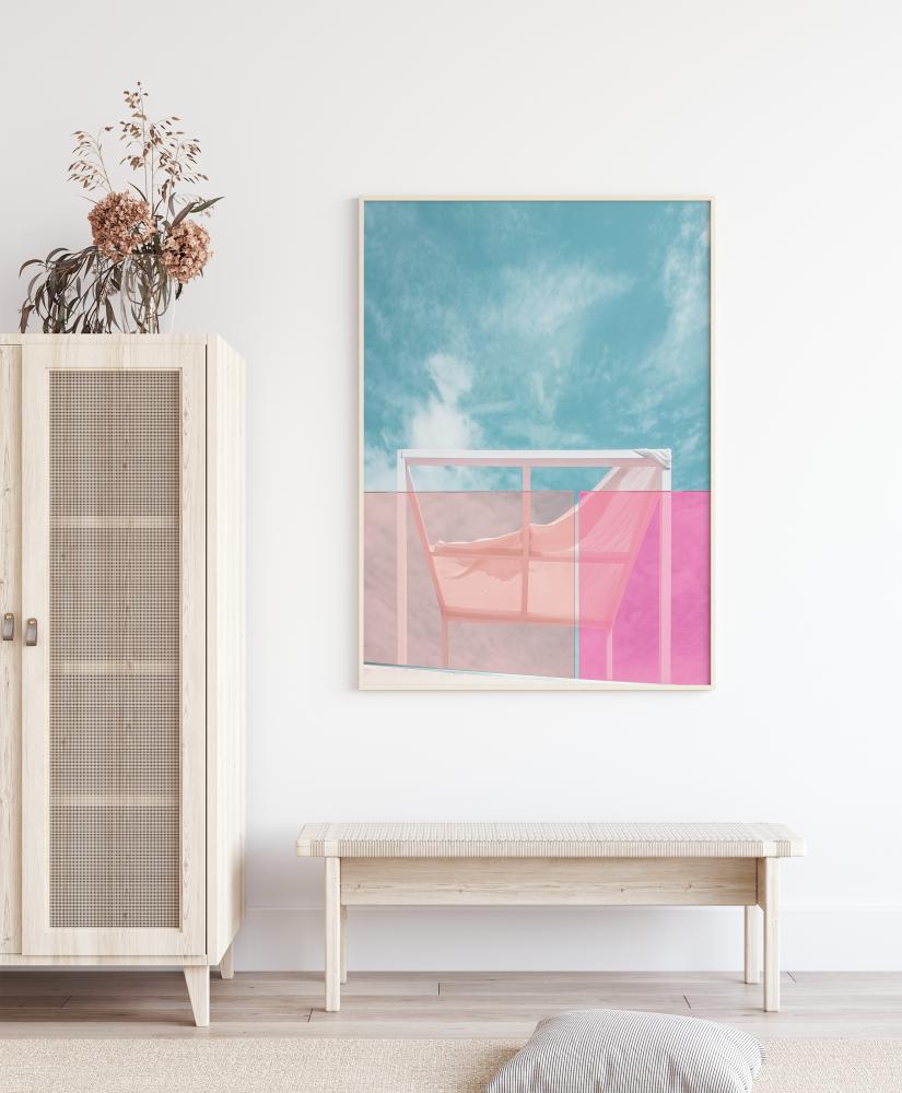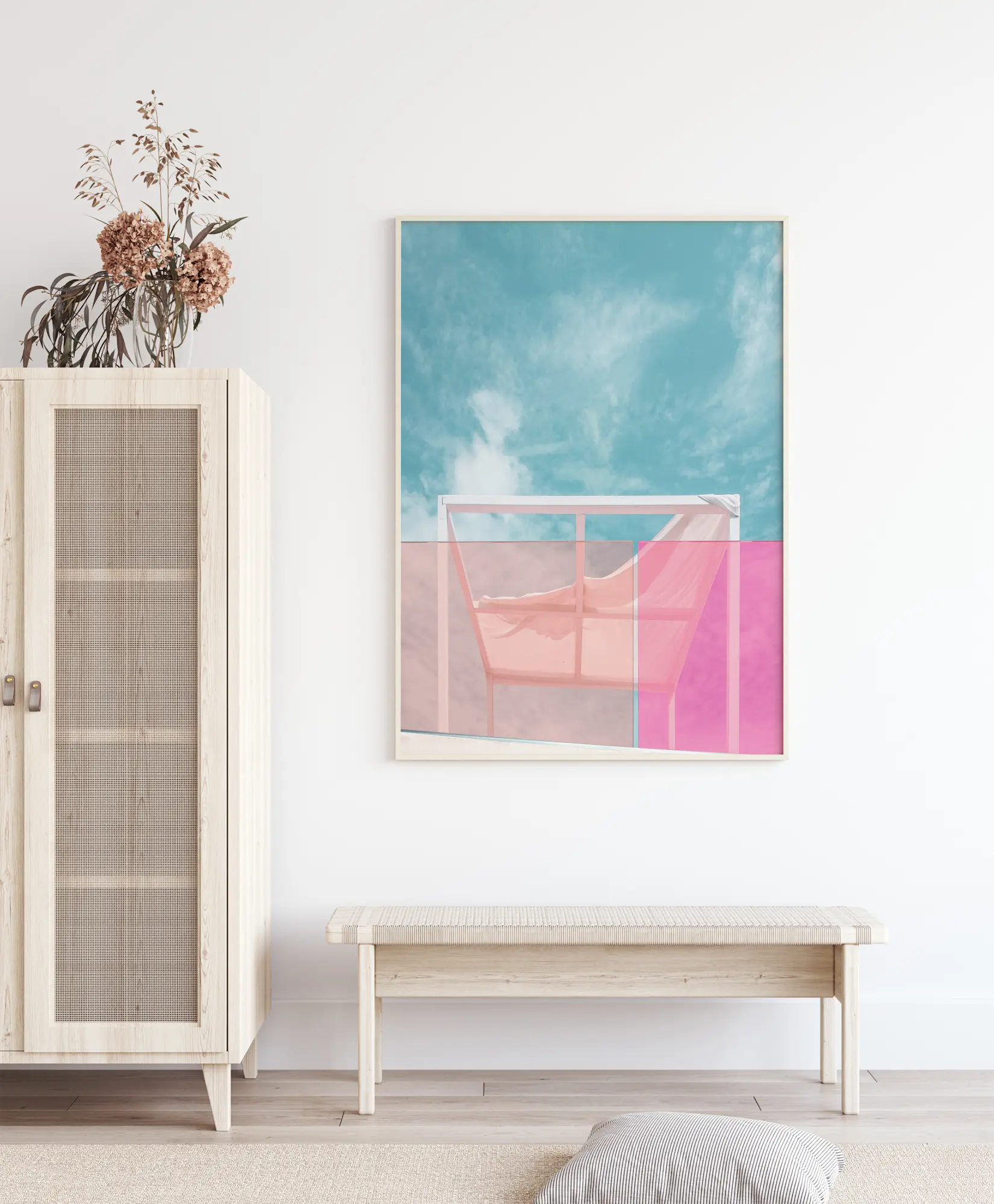 Egy színes poszter nyáriséggel és napellenzővel. Az erkély rózsaszín üvegén keresztül látható a fehér tető és a puha fehér felhők a kék égen. Képzeld el, hogy itt napozol a tetőn egy meleg nyári napon.