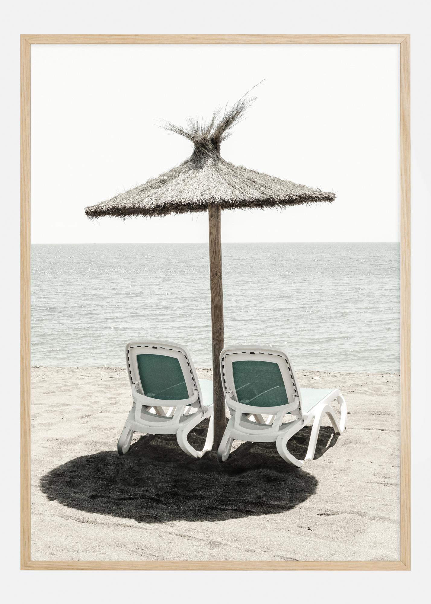 Álmodozz a hullámok hangjára és a napsütötte homok érzésére ezzel a megnyugtató poszterrel. Két üres napozóágy egy szalmából készült napernyő alatt hívogatóan vár a tengerparton, a tenger horizontjával a háttérben. Ez a csendes jelenet a pihenés és a mindennapokból való menekülés kifejezése.