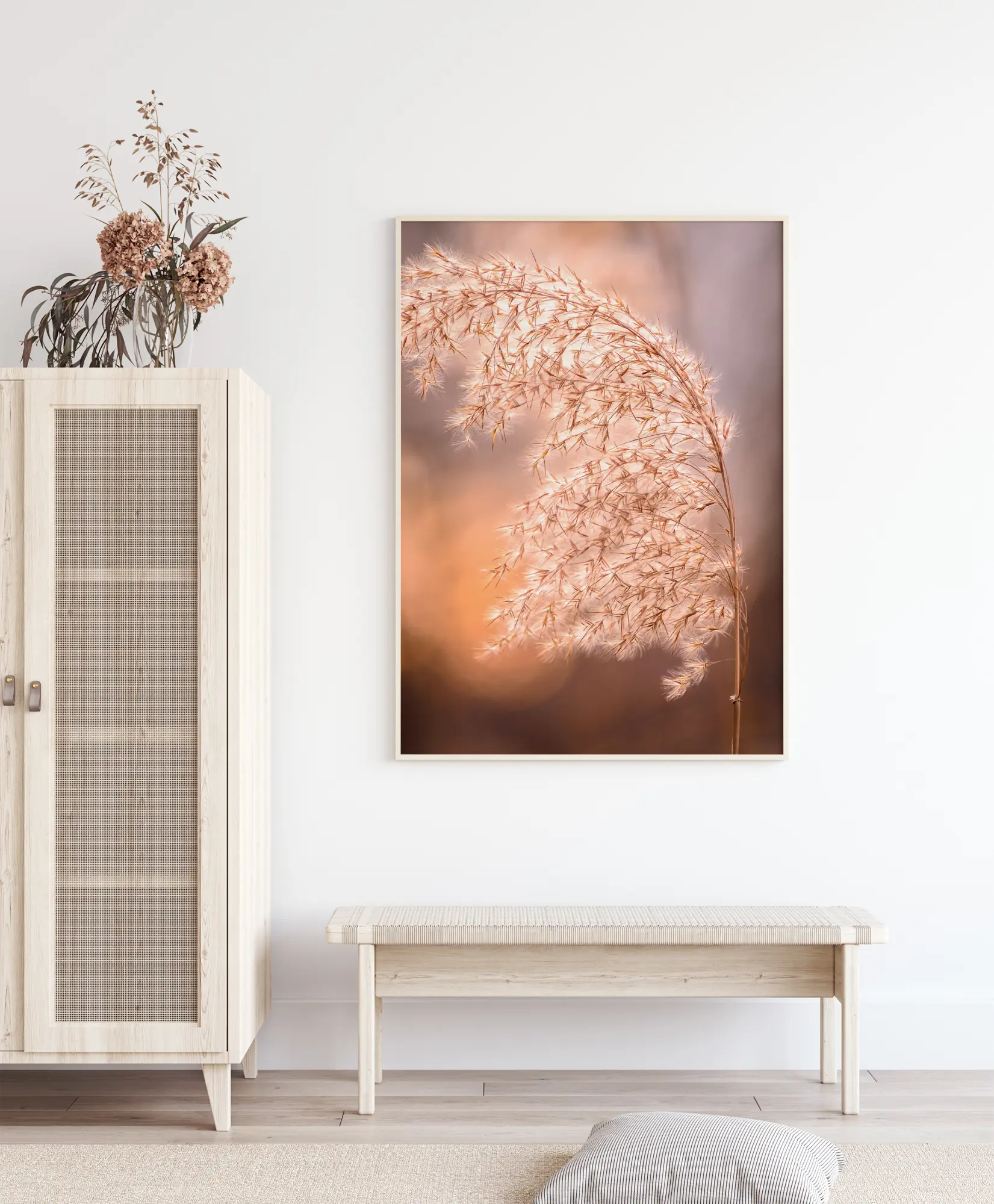 Egy nyári poszter egy magas fűszállal a kora nyári napsütésben. A fűszálat egy lágy barackfény világítja meg, és a pelyhes fűmagok körül glória keletkezik. Barack színű és rózsaszín fény járja át a képet, nyári, romantikus hangulatot teremtve.