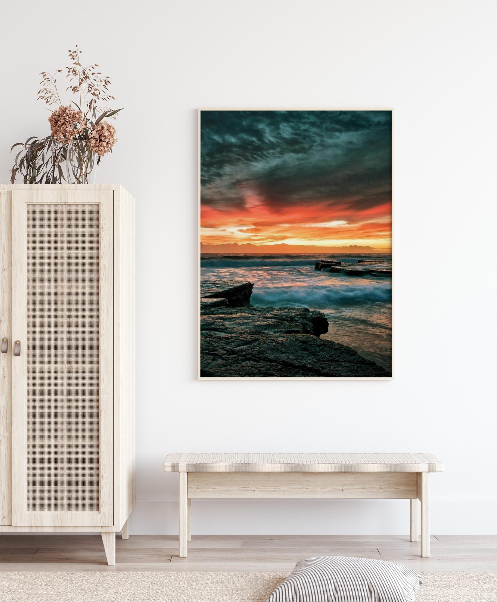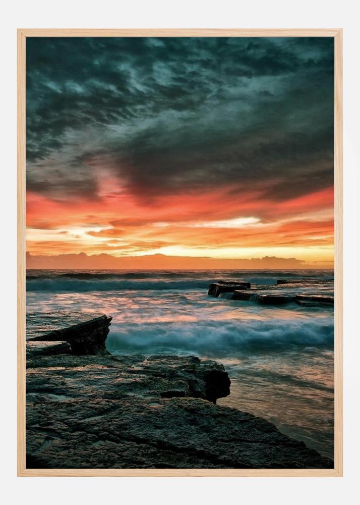 Egy epikus poszter egy naplementéről a víz fölött. A tenger hullámai csapódnak a lapos, sziklás partra. Sötét felhők vannak közvetlenül felettünk, egy élénkpiros naplemente pedig alacsonyan a horizonton, amely drámai és lenyűgöző képet alkot, ami fenntartja a figyelmed.